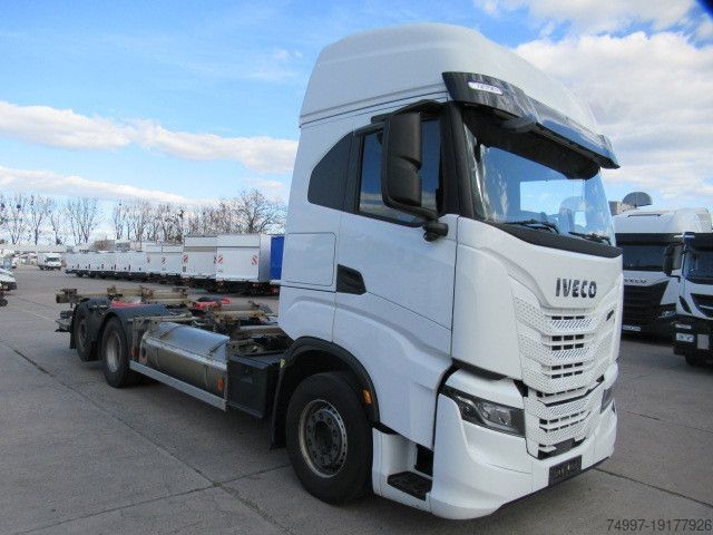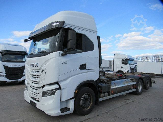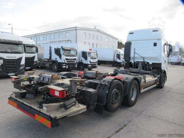Color white IC 194, empty weight: 10805 kg, permissible total weight: 26000 kg, air suspension, 1 x airbag, folding aluminum tail lift, steered lift axle, intarder, tachograph, electronic braking system EBS, electronic stability program ESP, traction control ASR, comfortable seat for driver/passenger, air-suspended driver/passenger seat, height-adjustable driver seat, passenger armrest, heated seat for driver/passenger, lane departure warning system, multifunction leather steering wheel, lumbar support for driver/passenger, electric windows, roof spoiler, electric and heated exterior mirrors, tire pressure monitoring system, central locking with remote control, rear differential lock, underride protection, sun visor, cool box, daytime running lights, turning assistant, - For 7.45 containers, errors and changes excepted.