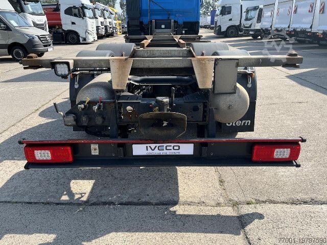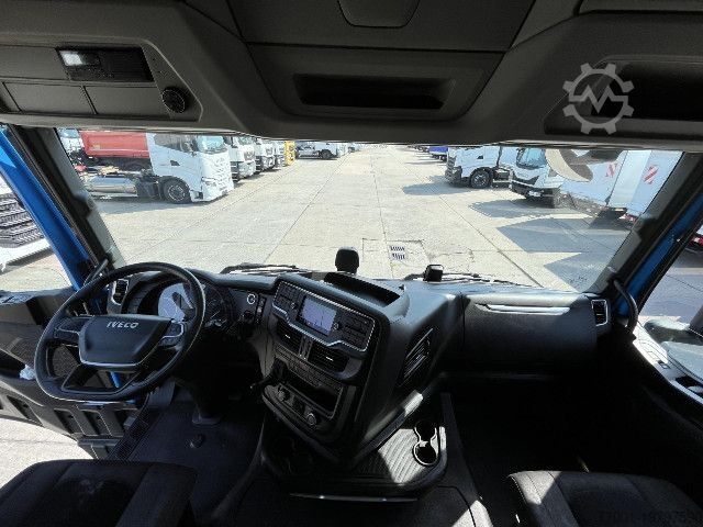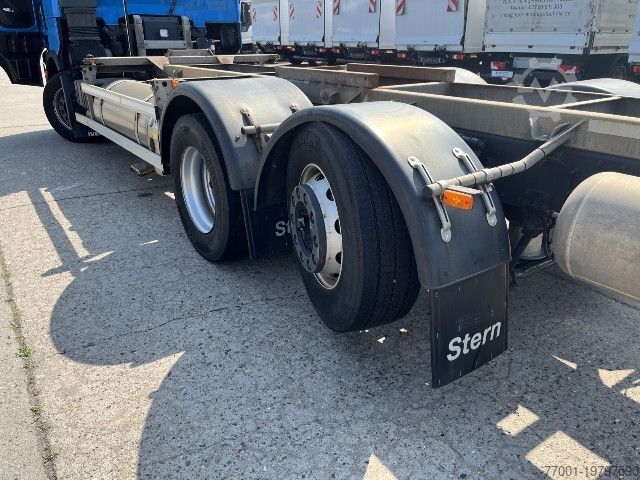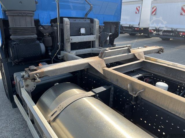 Color: Sky Blue IC 051, Unladen weight: 9,740kg, Gross vehicle weight: 26,000kg, 1st axle: 385/55 R22.5, 2nd axle: 315/70 R22.5, 3rd axle: 315/70 R22.5, air suspension, 1 x airbag, steered lift axle, intarder, digital tachograph, BDF swap chassis, electronic stability program (ESP), traction control system (ASR), air-suspended driver's seat, height-adjustable driver's seat, driver's armrest, driver's seat heating, lane departure warning system, multifunction leather steering wheel, driver's lumbar support, electric windows, roof spoiler, electric and heated exterior mirrors, tire pressure monitoring, central locking with remote control, rear differential lock, underrun protection, sun visor, cool box and refrigerator, daytime running lights. Errors and changes excepted.