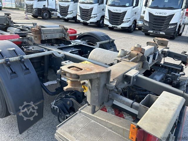 Color: White IC 194, Unladen weight: 10,805 kg, Gross vehicle weight: 26,000 kg, 1st axle: 385/55 R22.5, 2nd axle: 315/70 R22.5, 3rd axle: 385/55 R22.5, Air suspension, 1 x airbag, Foldable aluminium tail lift: Dautel Slider 1,500 kg, Steerable lift axle, Retarder, Tachograph, Electronic Stability Program (ESP), Traction control (ASR), Comfort driver/passenger seat, Air-suspended driver/passenger seat, Height-adjustable driver’s seat, Passenger armrest, Heated driver/passenger seat, Lane departure warning system, Multifunction leather steering wheel, Lumbar support driver/passenger, Electric windows, Roof spoiler, Electrically adjustable and heated exterior mirrors, Tire pressure monitoring system, Central locking with remote control, Rear differential lock, Underrun protection, Sun visor, Cool box, Daytime running lights, Turn assist, Container lock system 7.45, Errors and changes excepted.