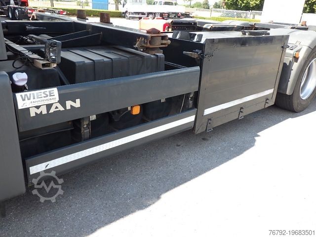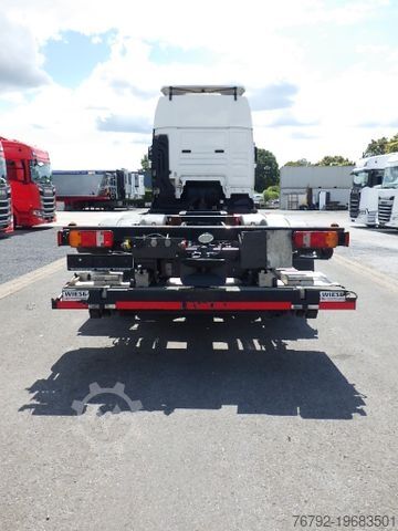 BDF swap body frame with a ride height of approx. 1220 mm and suitable for swap bodies of 7150 mm and 7450 mm lengths, Palfinger underride foldable tail lift 2000 kg, aluminium platform approx. 1800 mm, XXL long-distance driver's cab with 2 berths, ZF intarder, automatic climate control, Waeco stationary air conditioning, auxiliary heater, external sun visor, roof spoiler, comfort driver's seat air-suspended and heated, double electric window lifters, electric adjustable and heated exterior mirrors, roof spoiler, ESP, ABS/ASR, ACC – adaptive cruise control, LGS IV – lane change warning system, disc brakes with EBS, Emergency Brake Assist 2 (EBA2), not switchable, emergency braking signal (ESS), MAN BrakeMatic, EVBec, regulated rocker arm brake, 12-speed ZF transmission type ZF 12 TX 2621 DD with MAN TipMatic shift, 590 litre aluminium tank (right), 60 litre AdBlue tank, digital tachograph, H7 halogen double headlights, fog lamps and additional high beams integrated in the bumper with cornering lights, LED daytime running lights, LED reversing lights, refrigerator, MAN Tronic (on-board computer), MAN Media Truck Advanced 12V radio with 7" display, navigation (display defective), MAN sound system, multifunction steering wheel, central locking with remote control, external storage compartments left and right, side toolbox left, towing coupling with two-line brake system, front and rear axles air-suspended with raise/lower function, trailing axle liftable and steerable, rear axle differential lock, wheelbase 4500 mm, gross vehicle weight 26,000 kg / payload 16,190 kg, permissible gross combination weight 44,000 kg, 2nd owner, regularly serviced by workshop, good general condition, ORIGINAL mileage (verifiable), Euro 6C engine, low-noise, German vehicle with German documents, sale to businesses only! All information without guarantee! Subject to errors and prior sale!