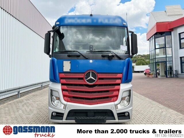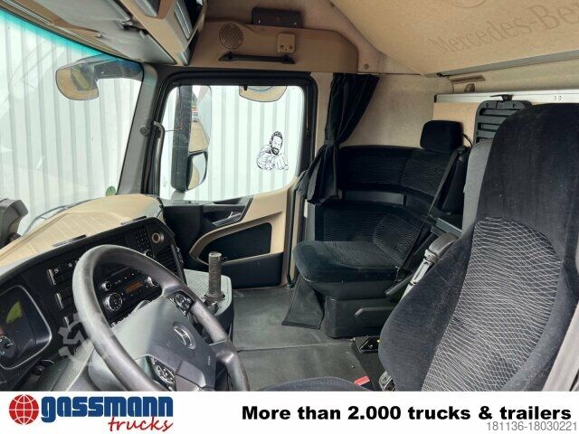 Wheelbase: 4900 mm Body: Mildner BDF swap frame Volumer front axle air-sprung, 8t front axle, rear axle disk wheel 440 hypoid 13t, 7.5t trailing axle unloadable, electronic brake system with ABS and ASR, disc brakes on front and rear axle, secondary water retarder, condensation water monitoring for compressed air system, Aluminum front underride guard, SoloStar Concept, residual heat utilization, auxiliary hot water heating, additional thermal insulation, electric lifting roof, start-up aid, StreamSpace, comfort locking system, economy drive program, Mercedes PowerShift 3, pre-installation for toll collection, tank capacity: 500l, on-board diagnostics, Active Brake Assist 2, ESP, Roll Control Assist, Lane Keeping Assist, Distance Keeping Assist, Attention Assist, driver airbag, refrigerator, Safety Pack Top, Climate Pack.