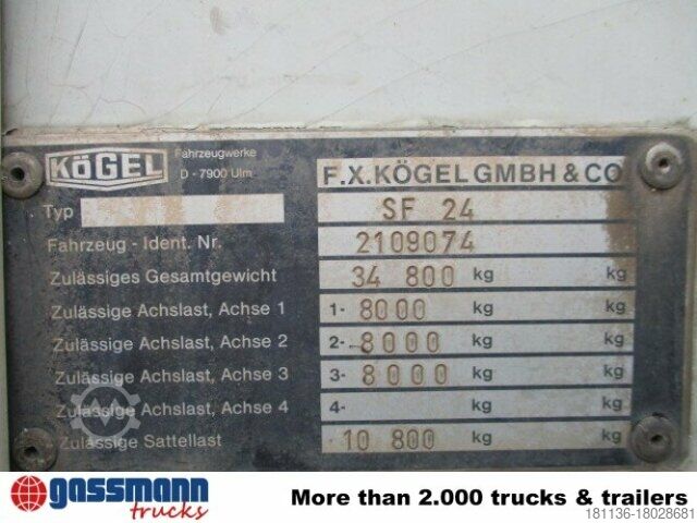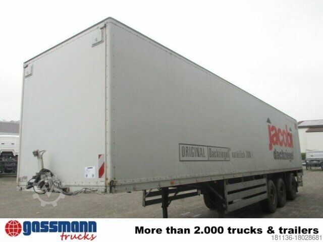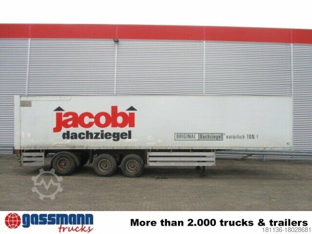 Body: box semi-trailer with roll-up door, last axle positively steered via wedge, was used by the previous owner as a factory-internal semi-trailer (for trade fairs).