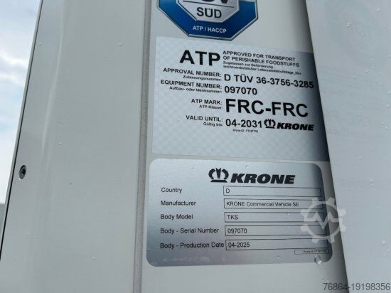 | Krone Cool Liner Multitemp refrigerated trailer - new vehicle | Double decker without beams - beams available on request | Flower width, lift axle | Krone axles with disc brakes | Toolbox | Spare wheel holder | ThermoKing SLXi refrigeration unit | Tires: 385/65 R22.5 | Diesel hours: 3h | Errors, input errors and advance sales excepted.