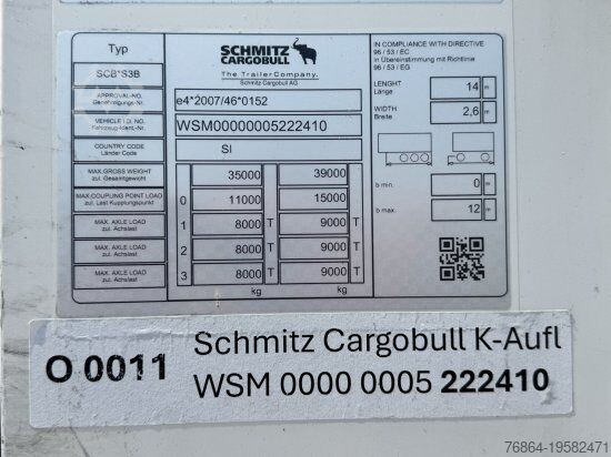 Schmitz Cargobull Refrigerated Trailer SCB*S3B | FRC valid until 03/2025 | Carrier Vector 1950 MT | Condition: Well-maintained | Ready for operation: Yes | Refrigeration unit: Carrier Vector 1950 MT | Diesel hours: approx. 1606 h | ATP class: FRC (suitable for deep-frozen foods) Technical specifications: Manufacturer: Schmitz Cargobull AG Type: SCB*S3B Year of manufacture: 2019 Gross weight: 39,000 kg Axles: 3 (with Knorr air suspension, ABS 2S/2M) Internal dimensions (approx.): Length: 13.40 m, Width: 2.60 m, Height: approx. 2.65 m Insulation: Suitable for deep-freeze transport down to -20°C Special features: Cooling down to -20°C | Diesel hour meter available | Carrier Vector 1950 MT | Reliable cooling performance | TIR prepared | Clean condition | Immediately ready for use!