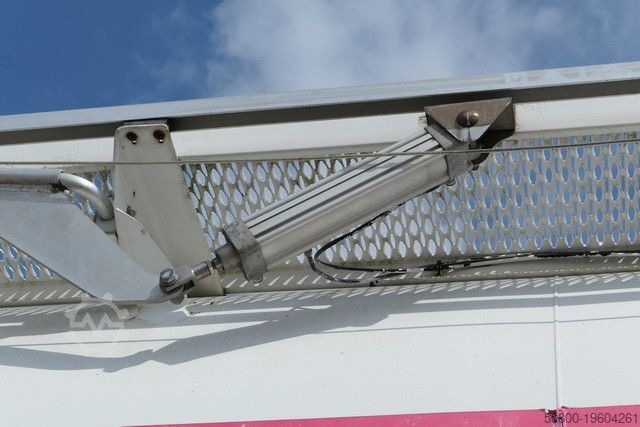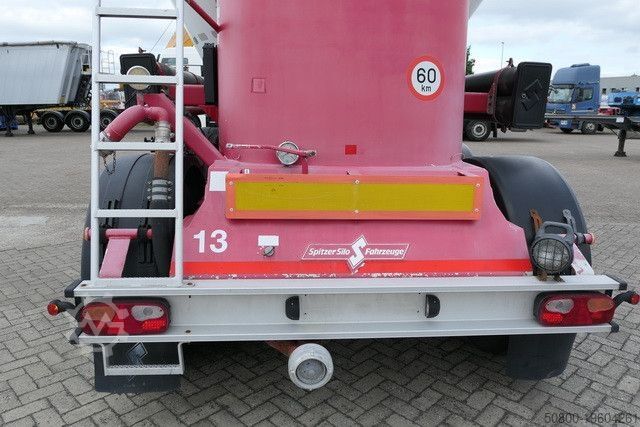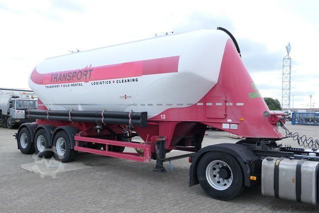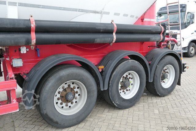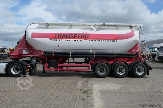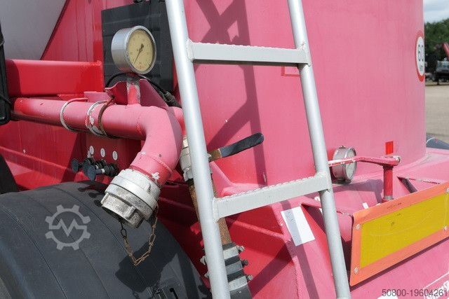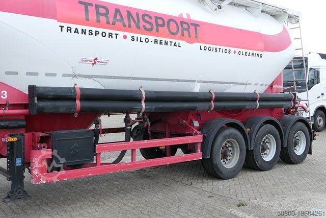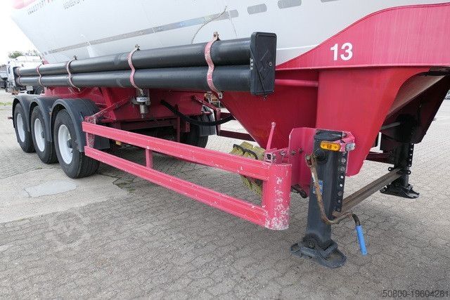 Силосная надстройка для сыпучих материалов, объём около 39 м³, рабочее давление 2,0 бар, рабочая температура: -40/80°C, 2 камеры, 2 люка, донные клапаны, центральный выпуск / сзади, 4 ящика для шлангов, соединение для пневматической разгрузки, манометр загрузки, площадка с пневматически откидывающимся ограждением на резервуаре, централизованная система смазки, боковая защита от наезда, опорные устройства JOST, 1 ящик для инструментов, ABS, ось BPW EcoPlus, 3-я ось - самоуправляемая, дисковые тормоза, алюминиевые диски, пневмоподвеска с функцией подъема/опускания, транспортное средство может быть оклеено рекламой и/или маркировано.
