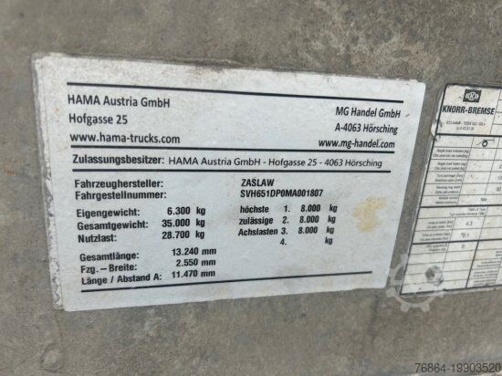 10 pairs of stakes | 1st and 3rd axles liftable | SAF axles with disc brakes | Unladen weight: 6510 kg, payload: 31490 kg | Toolbox | Tires: 385/65 R22.5 Full stock available at: Hofgasse 25, A-4063 Hörsching | Subject to error, misentry, and prior sale. | Sale to business customers only
