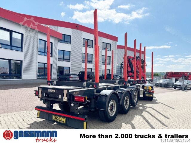 Construction: 3-axle timber transport trailer with 6x Exte bolsters and telescopic function, 9.4m to 12.9m, 3x 9t SAF axles, disc brakes, 1st axle liftable, 3rd axle with self-steering and electric reverse lock, 6x Exte steel bolsters with Exte square stanchions, 2 fifth wheel heights (1280mm and 1430mm), required front swing radius approx. 1400mm, electric frame release ISS 5km/h + TEC.