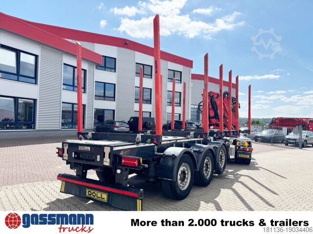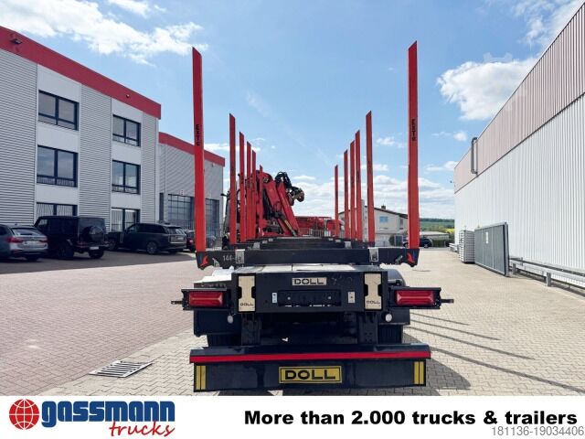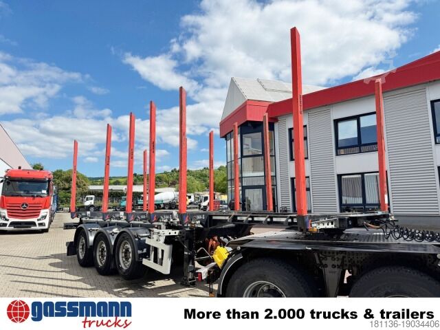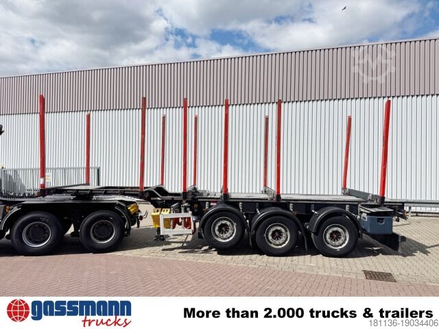 Construction: 3-axle timber transport trailer with 6x Exte bolsters and telescopic function, 9.4m to 12.9m, 3x 9t SAF axles, disc brakes, 1st axle liftable, 3rd axle with self-steering and electric reverse lock, 6x Exte steel bolsters with Exte square stanchions, 2 fifth wheel heights (1280mm and 1430mm), required front swing radius approx. 1400mm, electric frame release ISS 5km/h + TEC.