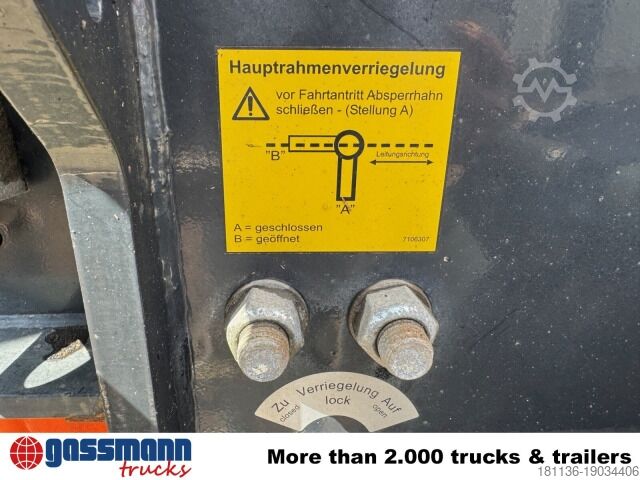 Vehicle location: Bovenden, 3-axle, SAF axles, air suspension, 1st axle liftable, last axle with self-steering, lifting and lowering, ABS (anti-lock braking system), extendable, lashing eyes, underbody protection, side aluminum underbody protection, supports, storage box, stanchions.
