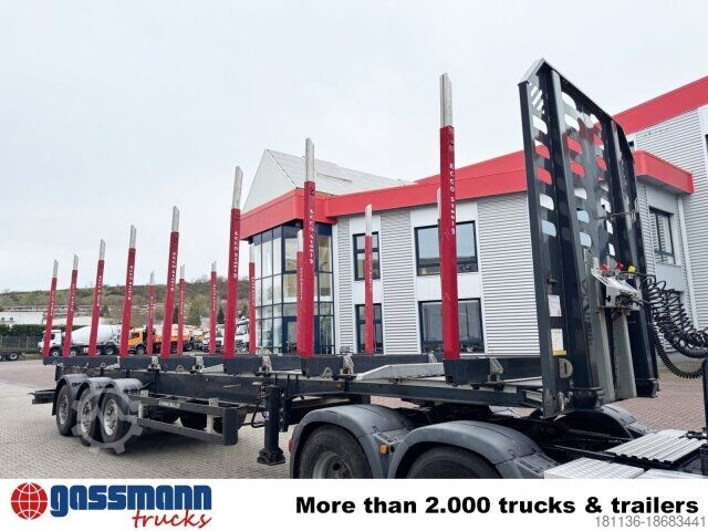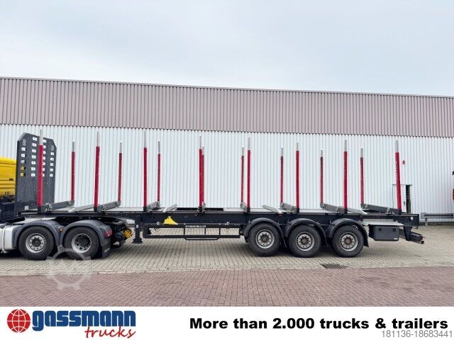 Construction: 3-axle timber transport trailer with 8 Ecco Steel stanchion bolsters, AS NEW! 3x 9t SAF axles, disc brakes, 1st axle liftable, replaceable 2 kingpins, fifth wheel height unloaded approx. 1150mm, 2240mm minimum free front distance from the center of the fifth wheel coupling, lightweight frame made of high-strength fine-grain steel.