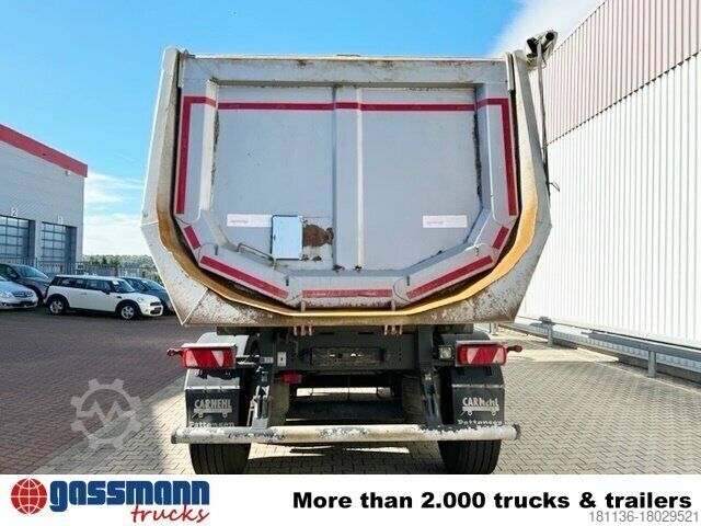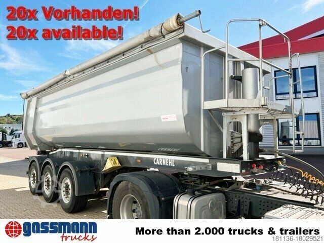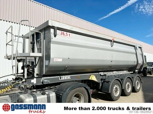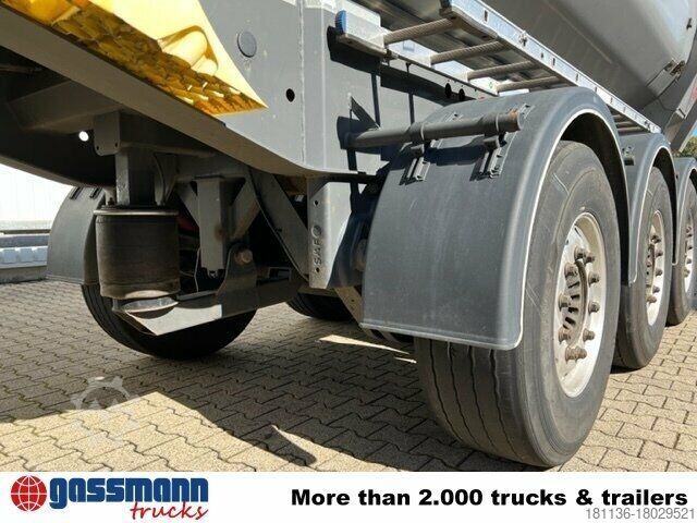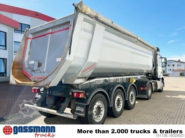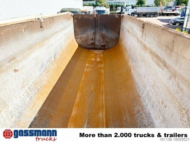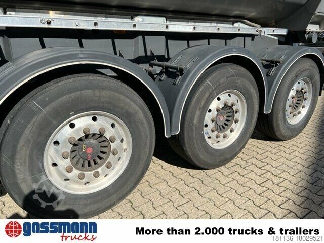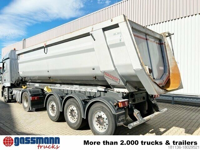 Wheelbase: 1310 mm Body: HARDOX round steel body approx. 29m³ with roller tarpaulin & platform 3x 9t SAF axles, disc brakes, fifth wheel height unloaded approx. 1220mm, chassis in lightweight construction, loading gauge, 1st axle liftable, roller tarpaulin, half shells made of 4mm HARDOX 450 HB, additional 4mm reinforcement in the dumping area, front wall 5mm thick, rear wall 1820mm inside 6mm steel, chute, steel platform, aluminum rims.
