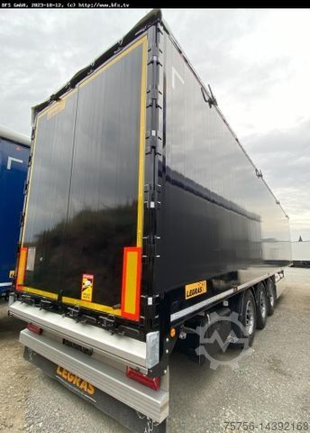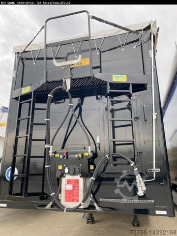 Saddle height 1,150 mm, Hydraulic: 110 l/mn, 225 bar, connections on front wall: 1''male screw pressure, 1''female screw return, BPW On Road Eco Air axles, lift 1..axle, EBS 2S/2M KNORR, JOST steel seat posts, closed side collision protection painted RAL 9010 w, 2 LED work lights behind 3rd axle and in front of support legs, 1x LED work light in the interior vo. top steel rims with black wheel hubs, 6kg fire extinguisher, 3-meter ladder, radio remote control for floor, shovel and broom holder, 2 toolboxes in overhang, 15-meter air hose with hydraulic drum and gun, 4400mm self-supporting chassis, 3/2mm aluminium body, walkway at front with 2 ladders, door in front wall left with ladder, floor type 10mm, aluminium mobile wall with tarpaulin 3800gr. and rail cleaner, rear doors each with two integrated locking bars 18mm, reinforced sealing doors, rear upper cross member can be unlocked by pin on the right-hand side, pneumatic door release, roof roller tarpaulin white 650gr. with lateral reinforcement 200gr on 600mm, 12 pairs of lashing eyes, wear plates side walls rear 3x1.5m, lashing straps integrated in side wall with stainless steel ratchets, side protection tarpaulin RAL7038 left