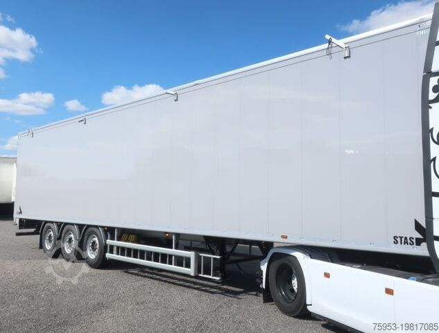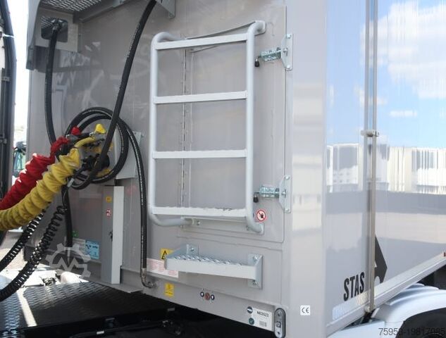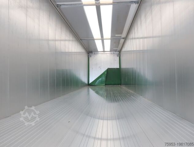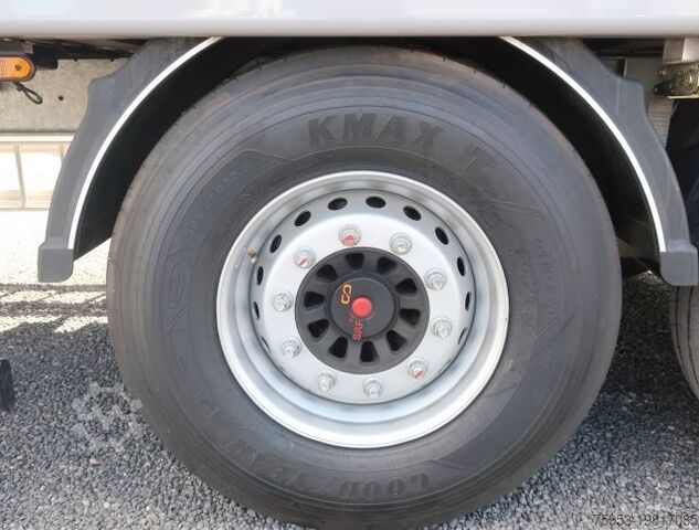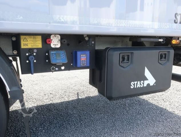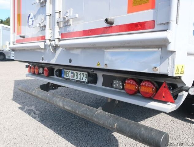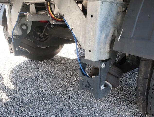 ABS, axle manufacturer Jost, aluminium chassis, colour grey, air suspension with lift function, raising and lowering mechanism, loading volume 90, lift axle 1st and 3rd axle, swing doors, disc brakes, fixed side underrun protection, toolbox, 2x LED reversing lights, 4x LED side reversing lights (2x on the landing gear + 2x behind the axle assembly), 1x LED spotlight in the cargo area, broom and shovel holder on left side underrun protection in the direction of travel, Cargofloor control type CF 500 SL-C - E"-CONTROL, 10mm ribbed with additional plastic guides below the floor profiles, double wing doors (1/2 - 1/2 with door end crossbar), radio remote control, rear door collision guard - aluminium bumpers across the entire width of the rear wall, bows and tarpaulin, service flap front left, work platform with access, sliding PVC tarpaulin (Panama quality, 900g/m²), load securing certificate DIN EN 12642 Code XL, production date 05/2025, immediately available, as new condition!!!