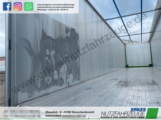 (2-3 mm) 600 mm wide completely welded with lower and upper belt, plank profiles fully welded inside, ALU front wall with 600 mm plank profile 2-3 mm thick in straight design, with 2 ALU wing doors 50/30 mm thick, running residual emptying wall with Kevlar tarpaulin approx. 1,500 mm long plus side with Kevlar ? plan seal