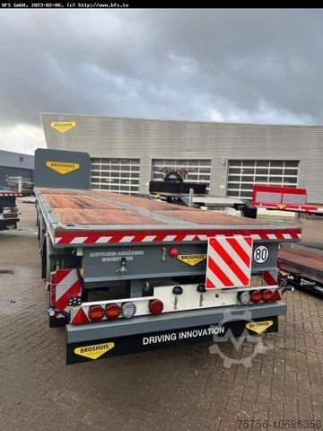 24 month guarantee from first registration, hydraulically steered hydraulically steered Nato Stweckdose central lubrication system fifth wheel dimension 1120 - 1300 mm loading height 1340 - 1520 mm depending on fifth wheel dimension 10t lashing eyes in the edge frame spacing 1200mm excess length board remote control rotating beacon pluggable LED 220V socket extension lights 3 axle telescopic semitrailer 1x extendable up to 7500 mm (500 mm steps) loading floor 28mm hardwood 10 ton lashing eyes in the edge frame (spacing 1200 mm) stake pockets in the edge frame for stakes 81 x 5 1mm removable front wall made of steel 1800mm high