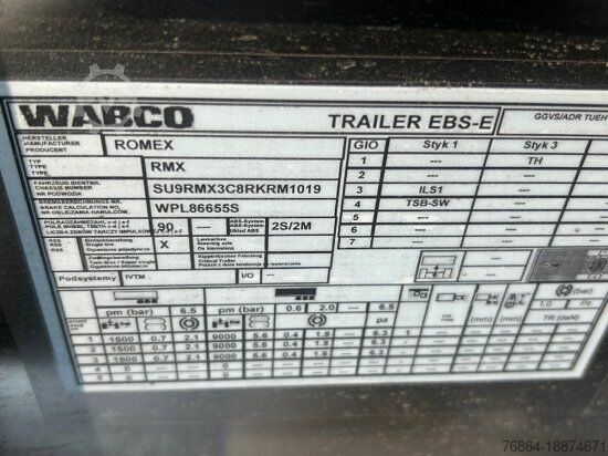 | Romex R-31 food tank trailer | 3 compartments 12000l, 6000l and 13000 liters | Insulated | SAF axles with disc brakes | Lift axle | Tires: 385/65 R22.5 | Spare wheel holder | Self-supporting - axle frame made of electropolished stainless steel | Insulation 100mm | Tank body: 2.5mm | Floors: 3mm | Baffles: 3mm | Errors, input errors and pre-sales excepted.