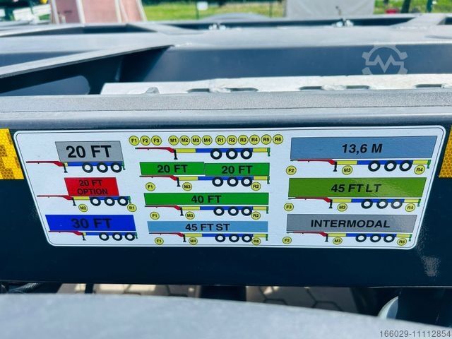 * Suitable for transporting 1x20 ft at the rear, 2x20 ft, 1x30 ft, 1x40 ft ISO, 1x 40 ft HC, 1x45 ft HC ST, 1x45 ft HC LT and 1x 13.60 CB (with special permit)