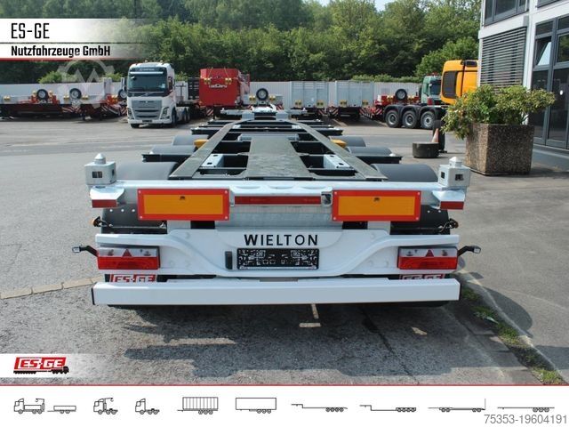 Configuration for the transport of containers: 45', 40' HC, 30', 20' center, 20' rear, 2x20', 40' ISO. Frame adjustment for a 40' ISO container. Rear pneumatic extension with additional mechanical locking pin. Container Master 45' R2. Extendable bumper. Steel underrun protection.