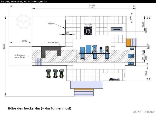 TRAILER as a special construction was used for presentation, events, and exhibitions! Approx. 1,250mm stairs + 750mm stage floor + 2,000mm extension driver side + 2,550mm vehicle width + 2,000mm extension passenger side + approx. 2,000mm folding stage passenger side = approx. 10,550 mm + entry platform stairs + maneuvering area