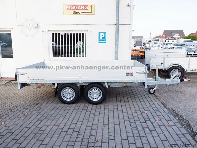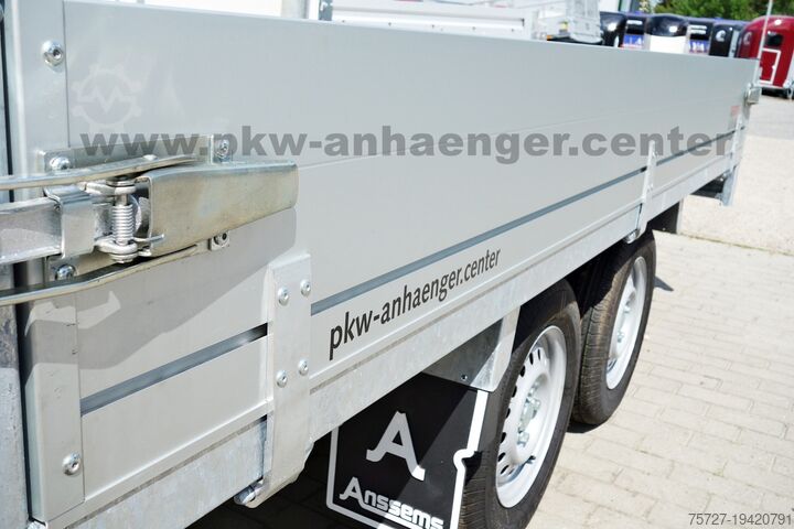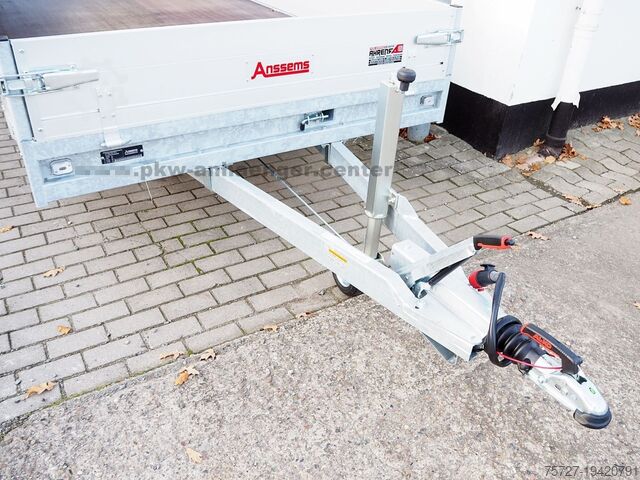 Standard features of the Anssems flatbed trailer include brakes, all-aluminium side panels that are foldable and removable, a pair of loading ramps stowable under the loading floor, robust eccentric latches, external and internal lashing rings, profile channels for accessories or load securing devices, a highly stable welded steel frame, extendable supports for the tailgate, jockey wheel, and a V-drawbar.