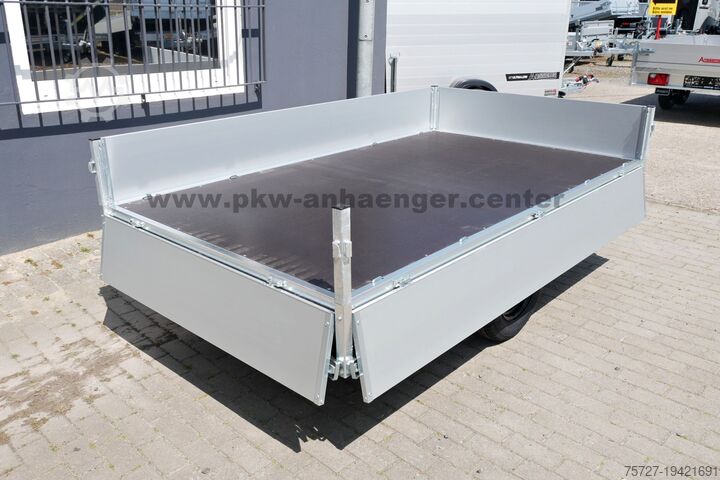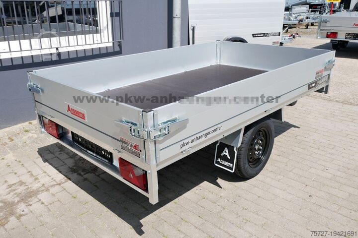 As standard equipment, the unbraked, single-axle flatbed high loader from Anssems features aluminium side panels that can all be folded down and removed, robust eccentric locks, interior lashing rings, profile channels for accessory fitting or load securing, a steel frame, jockey wheel, and a V-drawbar.