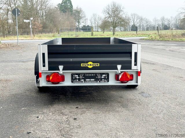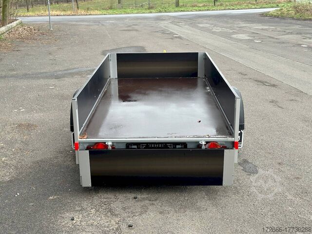 Hydraulics, automatic reverse drive, hot-dip galvanizing, unbraked, folding front wall, aluminium drop sides, * IMMEDIATELY AVAILABLE * incl. folding front wall, aluminium drop sides, Black Edition Technical data: - Type: New vehicle - TÜV: New/2 years - Availability: IMMEDIATELY! - Gross vehicle weight: 1,300 kg - Unladen weight: 237 kg - Payload: 1,063 kg - Interior dimensions: 251 x 131 x 35 cm (L x W x H) - Overall exterior dimensions: 380 x 181 x 90 cm (L x W x H) - Loading sill height: 53 cm - Tires: 185/65R14 steel rim - Brakes: yes - Support wheel: included! - 100 km/h: at extra charge - incl. vehicle documents Vehicle superstructure: - Floor: Wood, screen printing plate 15mm - Side walls: anodized aluminium double-walled 25mm - Side wall height: 35cm - Chassis: low loader, rubber spring axle - Folding side walls: front & rear - Hydraulics: no - Overrun device & brake: braked ALKO - Frame/chassis: V-traction fork - Attachment: at extra charge - Locks: Long lever locks / tension lock - Lashing eyes: 6 pieces in side wall (400kg/dAN) - Supports: at extra charge. - Lighting plug: 13-pin - Approval: COC papers Standard equipment: - Anodized double-walled aluminium drop sides - Rear drop side foldable - Front drop side foldable - Rear drop side removable - Wooden floor - Corner stanchions with insertion option for attachments or grids - Maintenance-free rubber spring axles - Axle with continuous axle beam and independent wheel suspension - 6 lashing brackets inside the side wall (certified 400kg/dAN) - Long-lever locks flush with drop side - ALKO overrun device and parking brake - Sturdy V-drawbar - 13-pin plug - Reversing lights - Large rear lights - Large rear lights - Rear lights - Large rear lights. plug - reversing lights - large safety lighting - integrated rear fog light - lighting recessed in rear frame - registration papers: vehicle registration document (ZBII) & COC papers Accessories can be retrofitted - please enquire: - Rear supports - Perforated railing on dropside - High front grille - High tarpaulin - Dropside attachment - Corrugated grille attachment 60cm - Spare wheel - Storage box - Rear supports - Ramps - Flat tarpaulin - Additional lashing eyes - Slot-and-hole rails for tension belts & locking beams - Rod strip with rubber coating for tension belts & locking beams - Reversing lights - Lashing straps - and much more. New vehicle with warranty and TÜV. We are happy to offer you suitable financing !, Descriptions and pictures are protected by copyright !!! Over 800 trailers immediately available for you! We are for over 30 years Brian James / Humbaur / Hapert / Unsinn / Cheval Liberte / Koch / Debon / Stedele / TPV / Tohaco / Vezeko / Variant / Vlemmix - specialized dealer & repair - workshop - delivery Germany-wide with surcharge possible! Anhänger Zentrum BAUMANN GmbH Dinxperloer Str. 389 46399 Bocholt - Errors, omissions and prior sale excepted -
