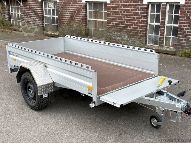 Hydraulics, Automatic reverse drive, Hot-dip galvanized, Unbraked, Folding front wall, Off-road tyres, Railing, Aluminium drop sides, * IMMEDIATELY AVAILABLE * Incl. folding front wall, off-road tires, railing, aluminium drop sides TECHNICAL DATA - Make: Humbaur - Model: HA 132513 KV Offroad - Vehicle type: Box trailer - Vehicle condition: New vehicle - First registration: Without first registration - TÜV/HU: 2 years from first registration - Internal dimensions (L x W x H): 251 x 131 x 40 cm - External dimensions (L x W x H): 379 x 185 x 97 cm - Loading height of floor: 55 cm - Perm. Total weight: 1,300 kg - Unladen weight: 270 kg - Payload: 1,030 kg - Chassis: Low loader (wheels next to the body) - Tires: 185R14C - Chassis: ALKO rubber spring axle - Support wheel: Yes - 100 km/h approval: Optional, can be retrofitted EQUIPMENT - Brakes: Yes - Number of axles: 1 - Floor: Wooden floor - Drop sides: double-walled anodized aluminium - Drop side height: 40 cm - Drop sides foldable: front + rear - Removable drop sides: Rear dropside - Dropside hinges: 2 at rear, riveted - Locks: Long lever locks, internal - Railing: Yes - Can be stored on edge : No - Number of pallet spaces: 3 - Tipping / lowering function: Without - Hydraulic pump: - - Overrun device/brake: ALKO - Frame/chassis: Steel side member, bolted - Galvanization: Hot-dip galvanized - Drawbar: V-drawbar, continuous, U-profile - Drawbar length: 120 cm - Folding drawbar: No - Mudguards: Plastic mudguards - Superstructures / attachments: Optional, attachable - Ramp shaft: No - Ramps/ramp flap: Optional - Ramp type: - - Ramp load: - - Drive-on angle: - - Supports: Optional, retrofittable - Lashing eyes: 6 - Rear lighting: bulbs, lamps recessed in rear frame - Side lighting: - - Plug for lighting: 13-pin - Vehicle documents: ZBII & COC papers DESCRIPTION - Anodized double-walled aluminium drop sides - Screen-printed wooden floor, continuous without joint, slip-resistant and waterproof - Rear drop side foldable - Front drop side foldable - Long lever locks flush with drop side - Continuous side members - Frame compl. hot-dip galvanized - V-drawbar - plastic mudguards - insertion option at all 4 corners for tarpaulin frames, lattice attachment, dropside attachments or front wall elevation - 6 lashing brackets inside the side edge (certified 400kg/dAN) - maintenance-free rubber spring axle from ALKO - automatic reverse drive - ALKO overrun device and parking brake - 13-pin plug - return driving licence - parking brake - parking brake - parking brake. plug - reversing lights - generously dimensioned safety lighting - integrated rear fog light - lighting recessed in the rear frame - support wheel with clampAccessories can be retrofitted - please enquire: - Rear supports - High front grille - High tarpaulin - Side wall attachment - Corrugated grille attachment 60cm - Spare wheel - Storage box - Rear supports - Ramps - Flat tarpaulin - Additional lashing eyes - Slot-hole rails for tension belts & locking beams - Rod strip with rubber coating for tension belts & locking beams - Reversing lights - Lashing straps - and much more. New vehicle with warranty and TÜV. We are happy to offer you suitable financing !, Descriptions and pictures are protected by copyright !!! Over 800 trailers immediately available for you! We are for over 30 years Brian James / Humbaur / Hapert / Unsinn / Cheval Liberte / Koch / Debon / Stedele / TPV / Tohaco / Vezeko / Variant / Vlemmix - specialized dealer & repair -