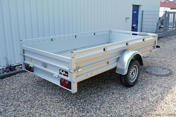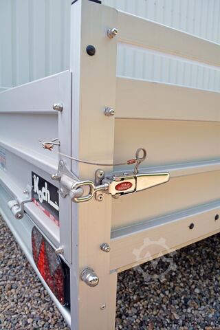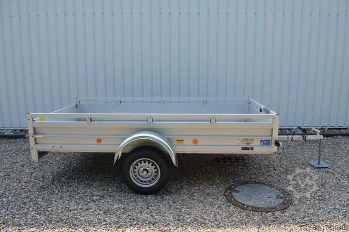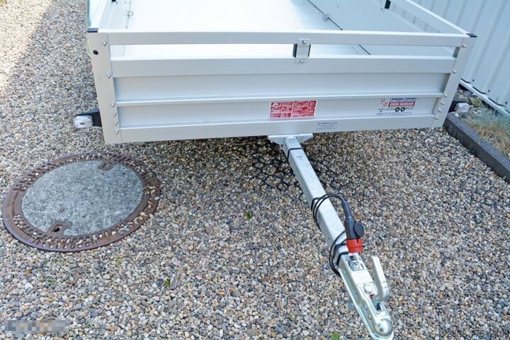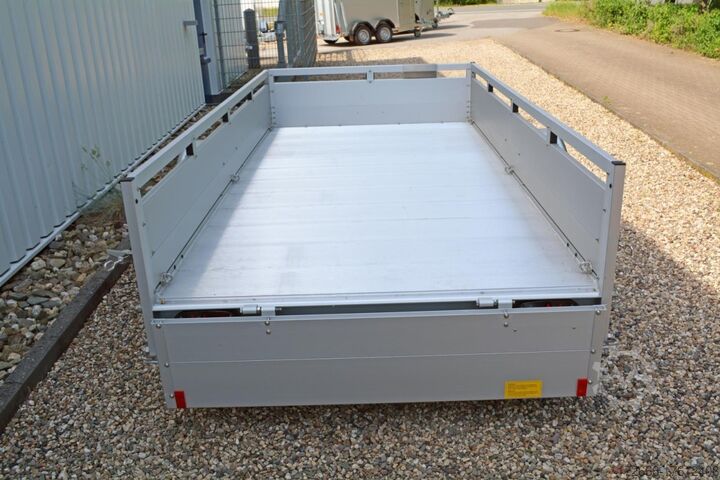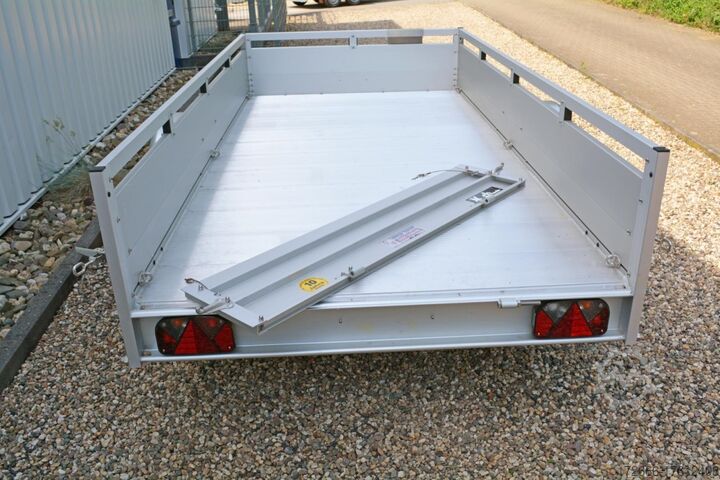 Hydraulics, automatic reverse, hot-dip galvanizing, unbraked, * IMMEDIATELY AVAILABLE * Technical data: - Type: New vehicle - Availability: Immediately!!! - TÜV: 3 years from first registration - Floor: Aluminum floor - Permissible total weight: 750 kg - Empty weight: 230 kg - Load capacity: 520 kg - Interior dimensions: 300 x 150 x 45 cm (L x W x H) - Exterior dimensions: 409 x 204 x 96 cm (L x W x H) - Loading sill height: 50 cm - Tires: 185/70R13 inch - Brake: no - Support wheel: at an extra charge - 100km/h: optional - Brake: no - Support wheel: at an extra charge. Standard equipment: - Double-walled anodized aluminium drop sides 30 mm, with integrated aluminium frame - Drop side with load securing system Accessories such as lashing eyes can be easily fitted without drilling. - Stainless steel lashing rings (V2A stainless steel) - Sturdy screen-printed floor plate, non-slip (birch wood, waterproof glued) - Very sturdy locks for the tailgate made of V2A stainless steel (unique) - Maintenance-free, hot-dip galvanized rubber spring axle - Chassis and drawbar from renowned manufacturer ALKO - Safety indicator on the coupling - Steel mudguards - Tailgate can be easily removed - 13-pin plug - Reversing lights - Large reversing light - Steel mudguards plug - reversing lights - large safety lighting - integrated rear fog light - lighting recessed in the rear frame - fitted with balanced 1A brand tires as standard - M8 stainless steel (V2A stainless steel) screw connection - clear operating sign with the most important data (tire pressure, cable assignment, etc.) - incl. transfer costs - incl. vehicle registration document Special equipment included in the price: - Full aluminum floor - Complete aluminum floor with ribbed surface. This means the floor lasts almost forever. Optional accessories available: - High front grille - Tarpaulin + bows - Supports, grilles, side wall attachments, nets, etc. New vehicle with warranty and TÜV. We are happy to offer you suitable financing !, Descriptions and pictures are protected by copyright !!! Over 800 trailers immediately available for you! We are for over 30 years Brian James / Humbaur / Hapert / Unsinn / Cheval Liberte / Koch / Debon / Stedele / TPV / Tohaco / Vezeko / Variant / Vlemmix - specialized dealer & repair - workshop - delivery Germany-wide with surcharge possible! Anhänger Zentrum BAUMANN GmbH Dinxperloer Str. 389 46399 Bocholt - Errors, omissions and prior sale reserved -
