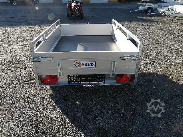 Braked single-axle low loader with aluminum drop sides and steel railing on the side drop sides and on the front drop side, rear drop side can be folded down, lashing bracket on the side with 400 daN, 13-pole electrical system, plastic mudguards, support wheel