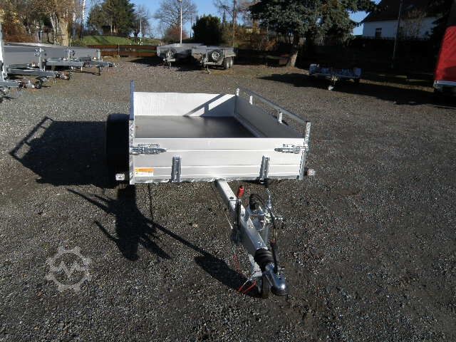 Braked single-axle low loader with aluminum drop sides and steel railing on the side drop sides and on the front drop side, rear drop side can be folded down, lashing bracket on the side with 400 daN, 13-pole electrical system, plastic mudguards, support wheel