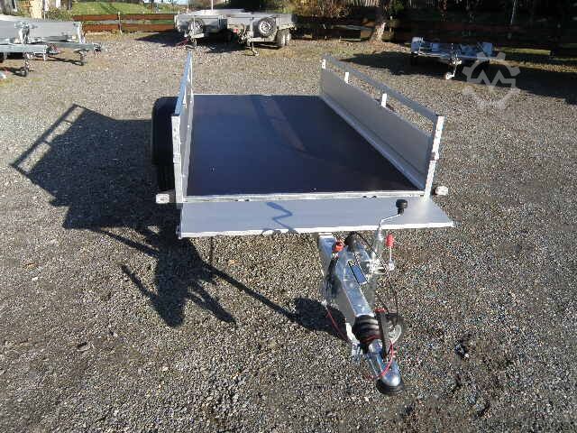 Braked two-axle low loader with aluminum drop sides and steel railing on the side drop sides and on the front drop side, rear drop side can be folded down, lashing bracket on the side with 400 daN, 13-pole electrical system, plastic mudguards, support wheel