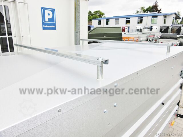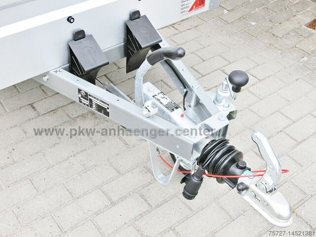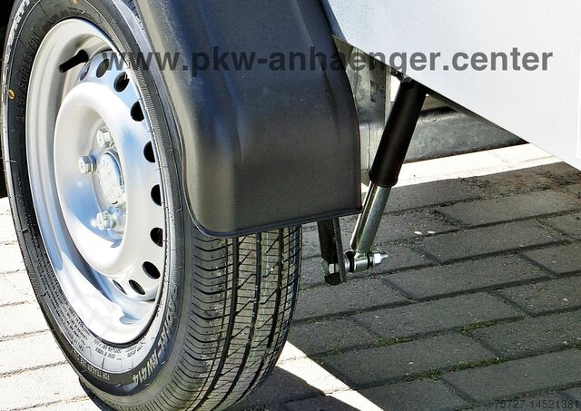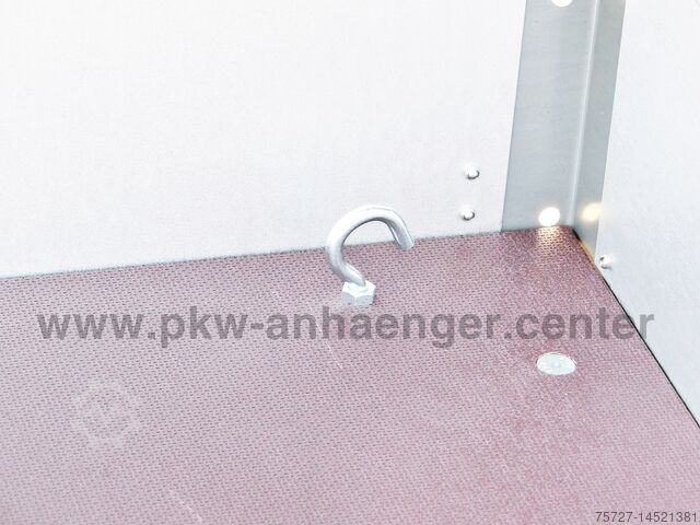 The standard equipment of the car trailer includes a lid with lifting aid and cross strut, support wheel with holder, four lashing eyes, net buttons, galvalum galvanized walls and a V-drawbar.