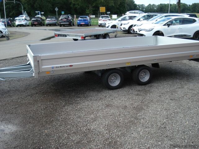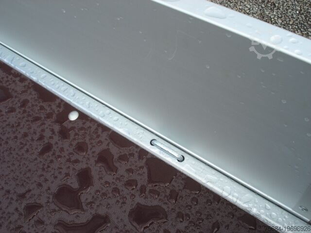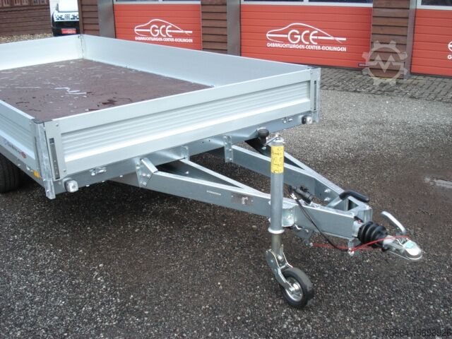Aluminium side walls, phenolic resin-coated plywood floor, 13-pin plug, automatic jockey wheel, 8 tie-down points on the load area, braked, rail box with flap, 10-inch wheels, low loading height of 600 mm, shock absorbers, approval for 100 km/h, V-drawbar