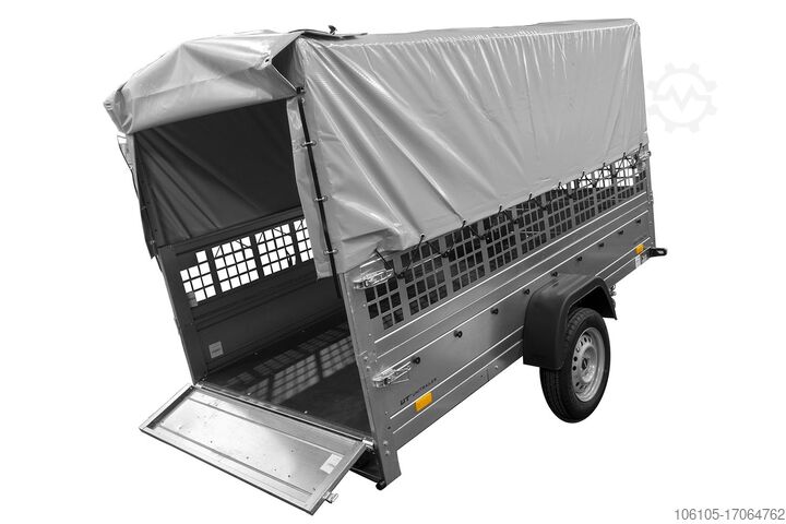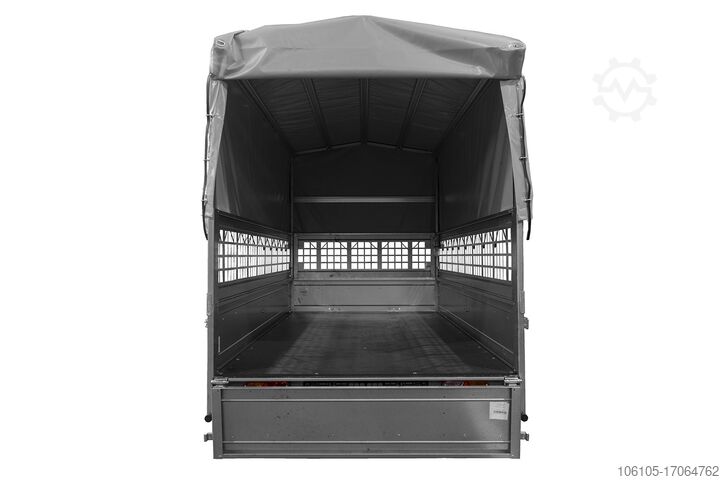 1-axle trailer GARDEN TRAILER 264 KIPP with leaf grid attachment, gray high tarpaulin, high bows and support wheel