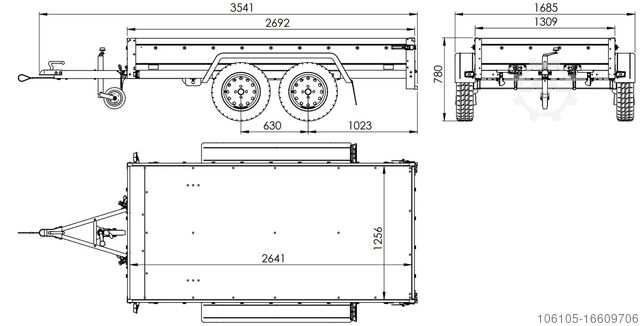 BODY - floor made of high-quality, waterproof, non-slip plywood, 9 mm thick with dimensions of the transport area: 2640 mm long x 1250 mm wide. Overall dimensions of the trailer: 3541 mm long x 1690 mm wide x 1120 mm high (with frame and tarpaulin)