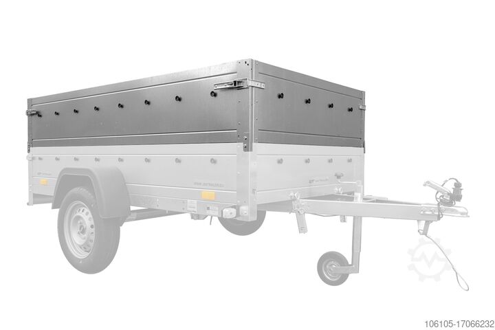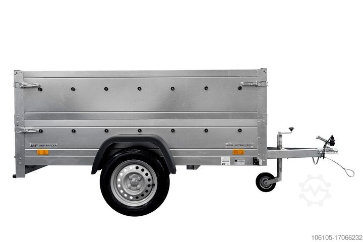 Anhänger 230x125 Garden Trailer 230 KIPP Unitrailer 750 kg mit Stützrad und zusätzlichen Bordwänden. Die Höhe der BIS-Bordwände beträgt 40 cm.