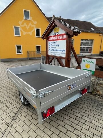 New series ! Two-axle, braked flatbed high loader with low loading area height, aluminium drop sides can be folded down and removed on all sides, welded, hot-dip galvanized steel frame, lashing recesses in the floor on the side in a V-groove, automatic jockey wheel, 13-pole electrical system with reversing light as standard