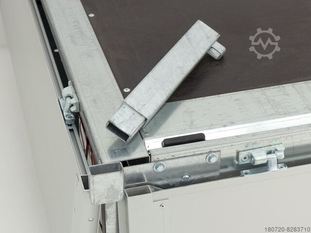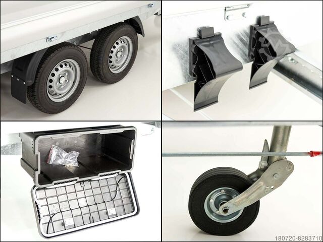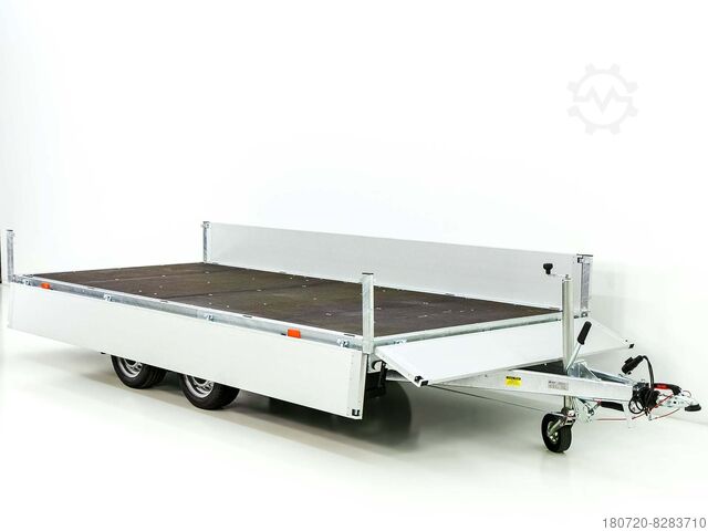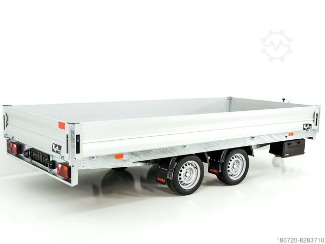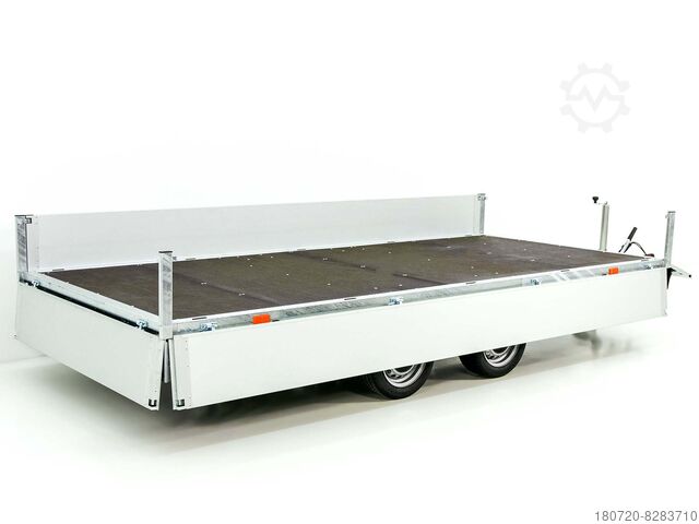 This versatile high loader trailer impresses with its spacious, flat loading area with a wooden floor plate. With a base area of 182 x 417 cm (width x length) and a loading area height of 30 cm, it offers plenty of space. For more storage space, the flatbed trailer is available with a matching 170 cm high tarpaulin (subject to a surcharge). For easy loading, the tailgate and side walls of this platform trailer can be folded down quickly and effortlessly. The floor frame profile with six lashing brackets allows all transported goods to be reliably secured. In addition to the good amount of space, the trailer's stability is also impressive: the payload is an impressive 2137 kg. The permissible total weight must not exceed 2.7 t.