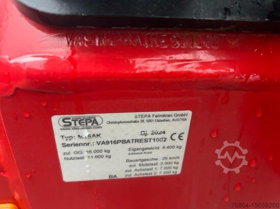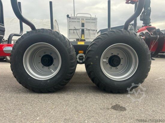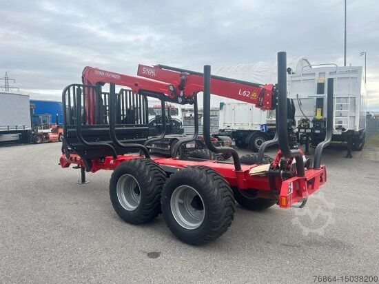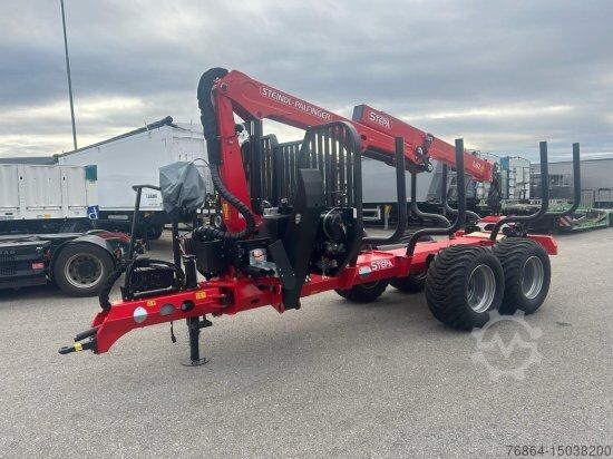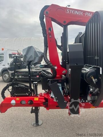 Steindl Palfinger forestry trailer 16 tonnes | Articulated drawbar with 2 cylinders, gearbox support foot, | 10 stanchion holders welded to the outside of the frame, 4 pairs of stanchions, | LED Stvo lighting system | Tires 550/45-22.5, FLAP-DOWN | Extendable frame, HEXAGONAL FRAME | 4 drum brakes o350mm for 8-hole rim - swing arms with wheelbase 1.20m | Pneumatic brake system with 2 Tristop cylinders and 2 diaphragm cylinders including wheel chocks, | License plate lighting and type approval 25 km/h | Bottom hitch | Support load: 2,000kg Errors, input and advance sales reserved. Steindl Palfinger forestry crane L | Standard equipment 9.5m RW including 4.5 tonnes flange rotator | 4-tab load sling (EPS-LINK), EPSILON crane column | Swivel mechanism with 4 swivel cylinders 2-circuit hydraulics CAN-BUS joystick control with 2 x 4-way control blocks electrically proportionally controlled including high stand, tarpaulin and high pressure filter, including BSZ plus an AUTEC radio remote control Hydraulic oil tank with 100 litres of hydraulic oil Hydraulic oil cooler with thermostat control Lifting cylinder protection Forestry package: Chainsaw, canister and sapling holder Headlight kit with 2x LED (1000 lumens) 2-rotary piston pump with console for universal joint drive and hydraulic oil 2x40 lt/600 rpm including screwed flange universal joint shaft Wood grapple with opening width 157 cm (0.30 m2), with flange rotator, reinforced version