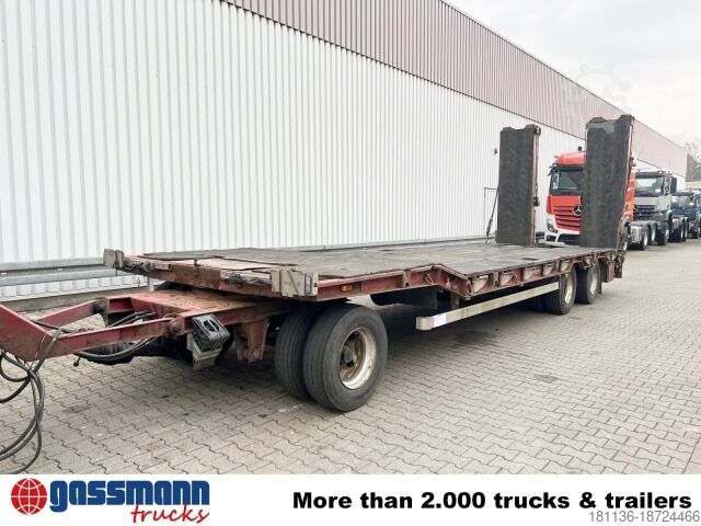 Construction: 3-axle low-loader trailer with 2-part hydraulic ramps, 3 x 10t BPW axles, drum brakes, extendable to 3m, excavator boom recess, floor and ramps with anti-slip surface!