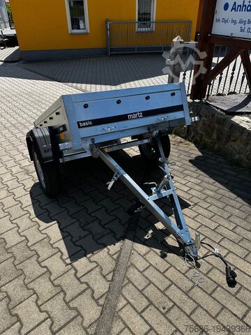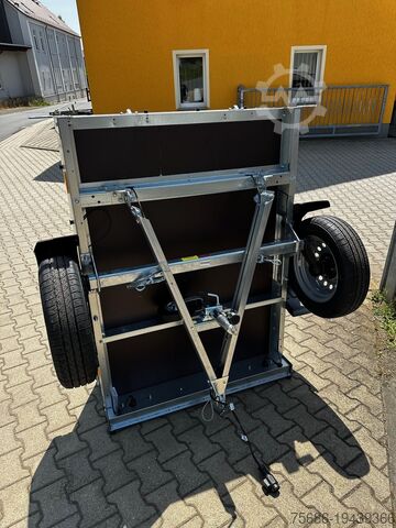 Unbraked single-axle low loader with steel side walls and foldable tow bar, 13-pin electrical system, plastic mudguards, jockey wheel.