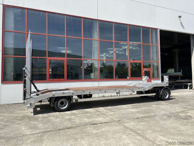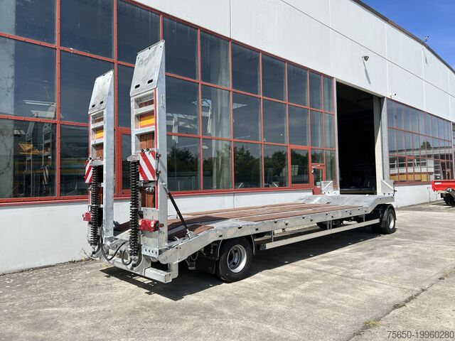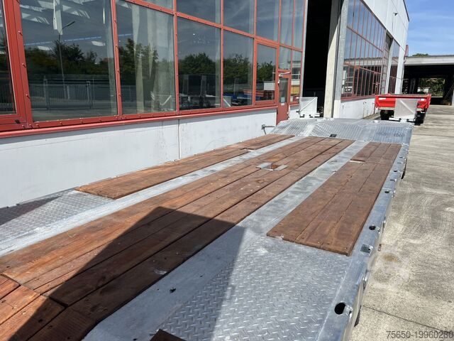 Total loading area length approx.: 8,800 mm, low bed approx.: 6,600 mm long, loaded loading height approx. 890 mm, 24 lashing rings each 10 t, 12 stake pockets in the outer frame, loading ramps (approx. 3,100 x 750 mm), climbing strip on the outer side of the ramps and rear slope, ramps laterally adjustable, ramp spring lifting device, 68 mm thick wooden floor, storage box with lid for lashing chains or tie-down straps, contour marking according to regulations, revolving beacon, vehicle hot-dip galvanized, -- subject to typographical errors, mistakes and changes, sample images --, More data at: !, More Details: !