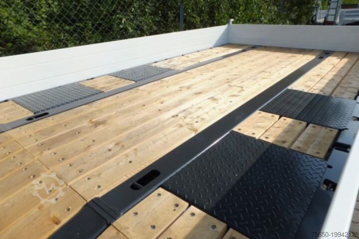 each ramp approx. 2,700 mm long x 560 mm wide, ramps with gratings, loading height: 840 mm, 12 lashing eyes each 2.5 t, 8 x lashing eyes each 6 t, steel drop sides, foldable and removable, wooden planks 50 mm, loading area rear beveled, loading area width inside 2.480 mm, rear stanchion removable, front for through-loading, , Also available in 5,300 mm loading area length! , , -- Misprints, errors and omissions excepted, sample pictures --, More data under: !, More Details: !