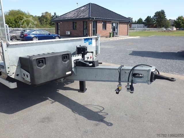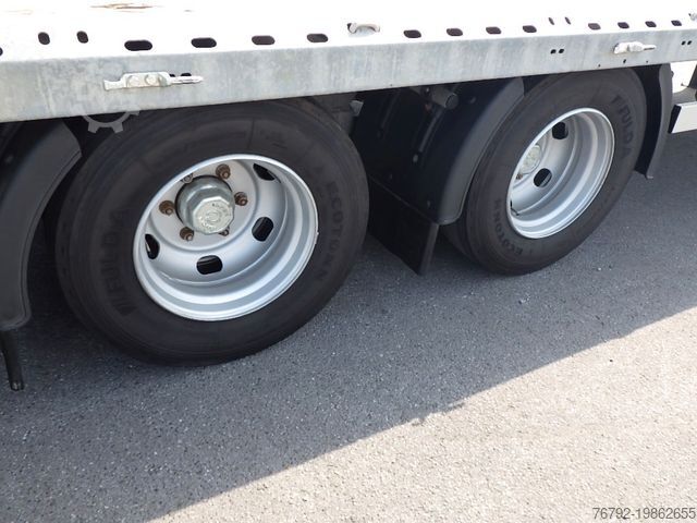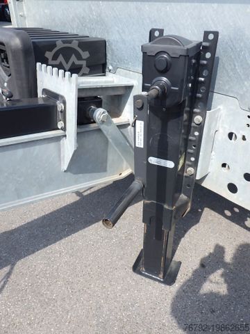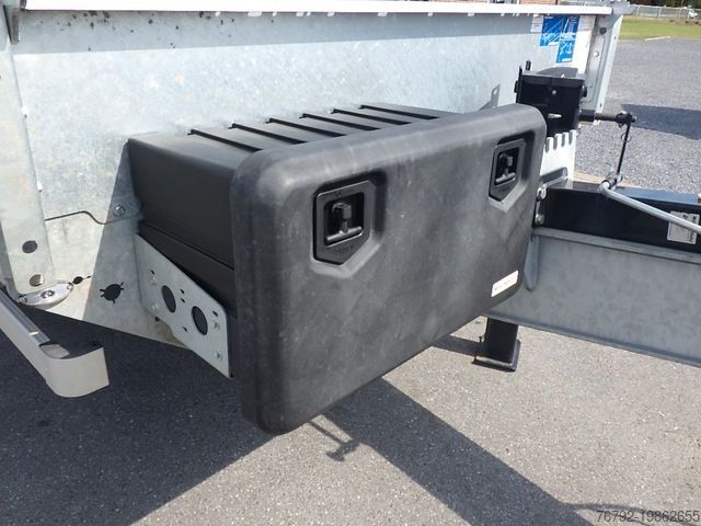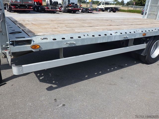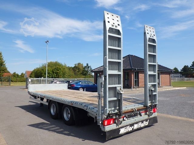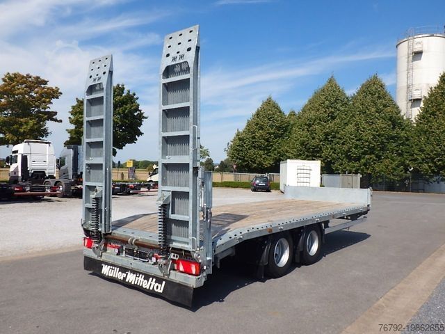 2-axle Müller-Mitteltal Type ETÜ-TA-R 14.4 tandem low-loader trailer with loading ramps, platform loading dimensions (internal) 6270 x 2470 mm, loading height approx. 950 mm, pins and locks for side walls present, plastic tool storage box in front of the bulkhead on the right, 4 lashing rings in the corners of the loading area, Multilock outer frame with universal load securing options, provision for retrofitting 2 pcs. container locks (twistlocks) in front of the bulkhead, 5 pairs of lashing brackets in the outer frame, spring-assisted access ramps approx. 2650 mm long and 600 mm wide, Gigant axles 2x 7000 kg with tapered roller bearings and cam brakes, parabolic suspension with equalizer, ABS, drum brakes with EBS, drawbar with 40 mm towing eye, height adjustable, Jost gearbox support jack at the front, rear support with 2 drop legs at the rear, tires 235/75 R 17.5, GVW 14,400 kg / payload 10,770 kg, 1st owner, as new general condition, sale only to commercial customers! All information without guarantee! Subject to errors and prior sale!