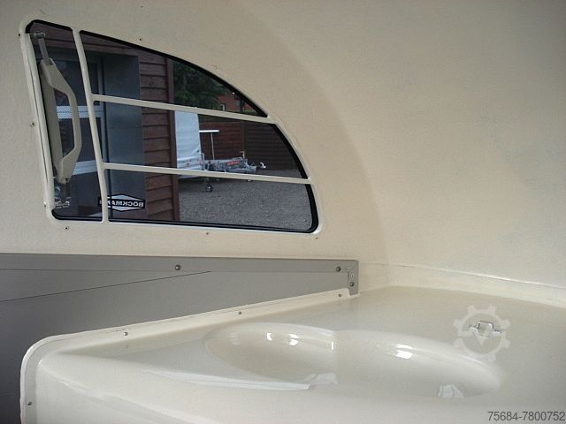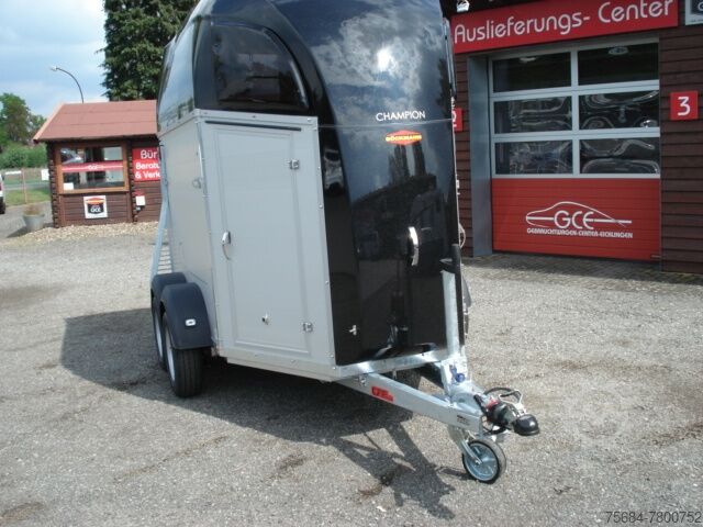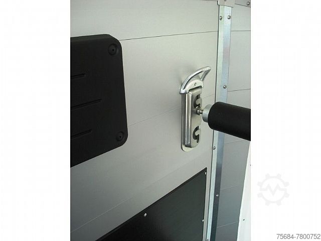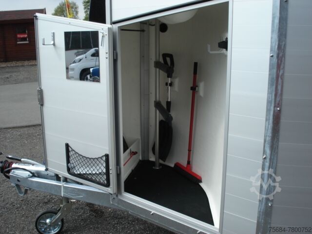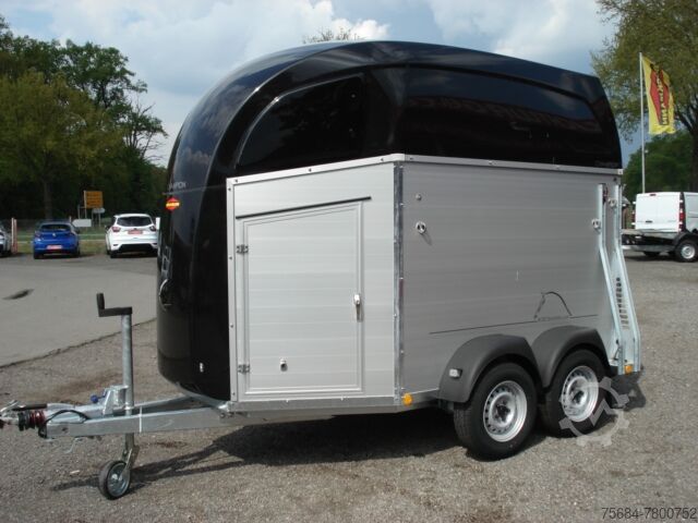 Capacity: 2 horses, aluminum side walls, aluminum floor, polyester hood and front in anthracite with pop-up windows (left and right), 13-pin plug, wheel chocks, V-drawbar, automatic support wheel, right-hand access door, tack room with accessories, side step guards and side padding, additional front box bar padding, interior lighting, tarpaulin lift with net, tailgate with cross step rails and side stops, anthracite metallic fenders.