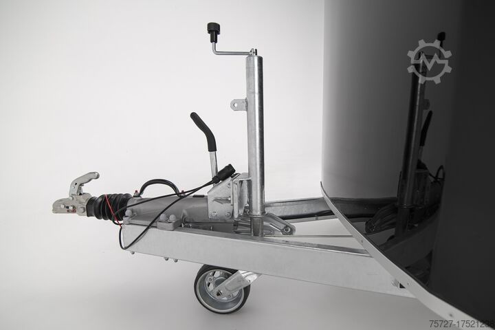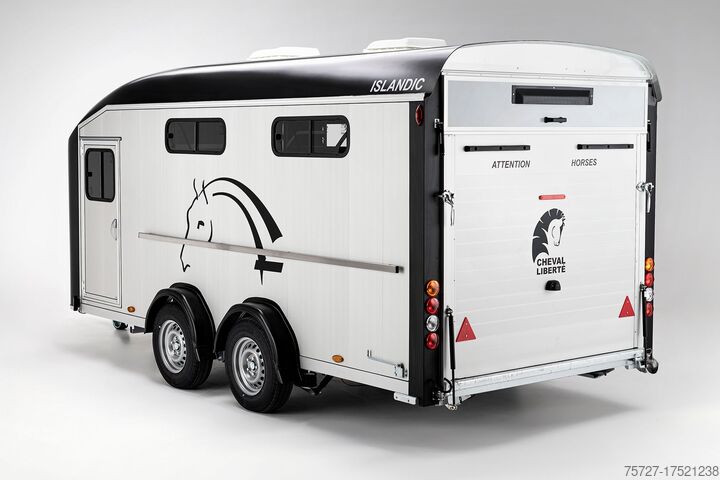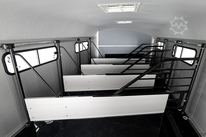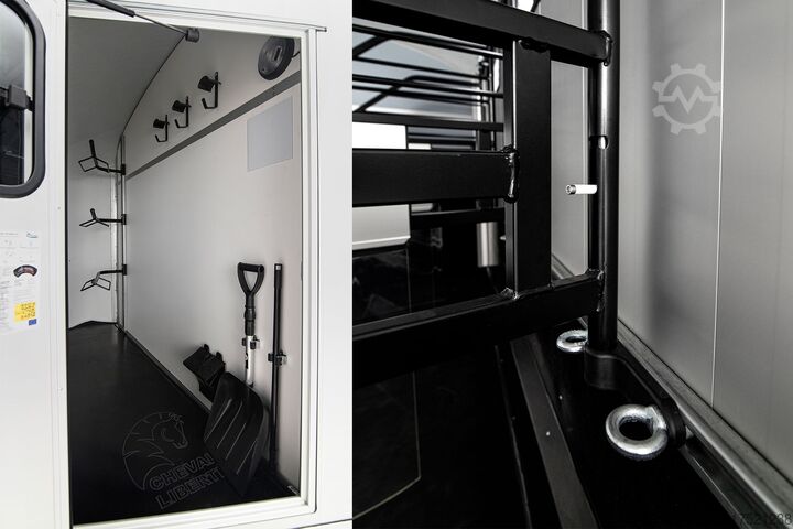 The horse trailer is equipped with an inclined position, partition walls with head grille, walk-in tack room, poly hood available in various colors, aluminum walls, aluminum floor, entrance door, flap and door system, Pullman chassis-2, 100km/h, interior light, automatic support wheel, sliding window, spare wheel, two roof vents in the hood, stable frame, V-drawbar and so on.