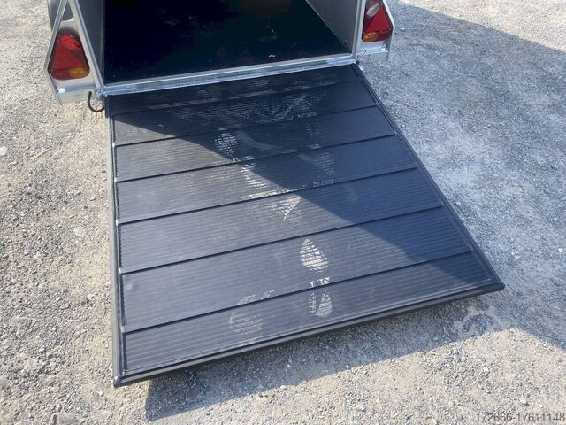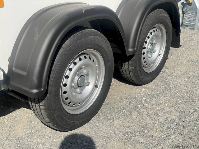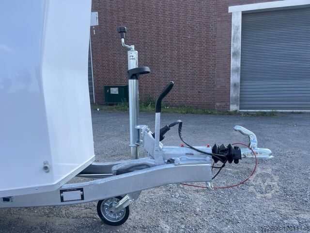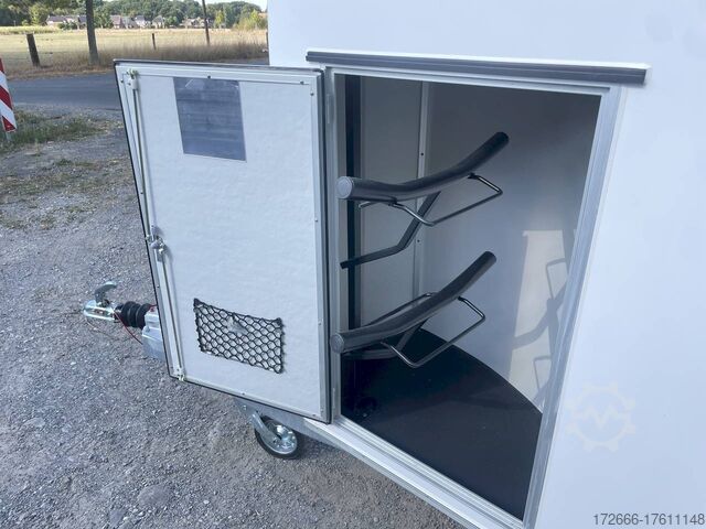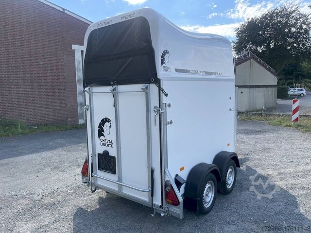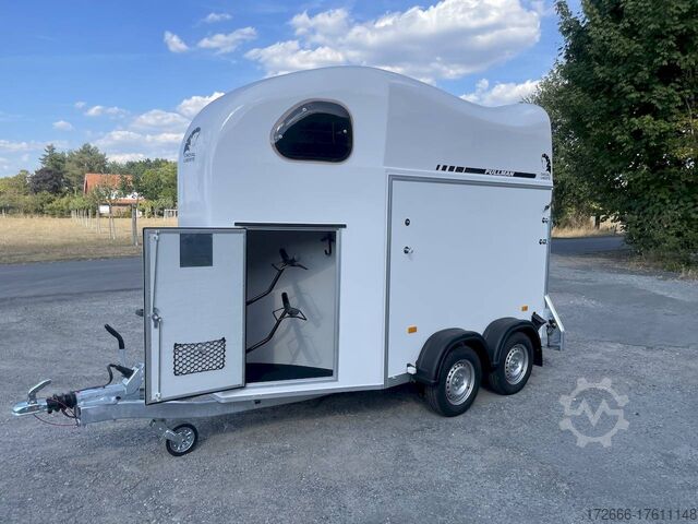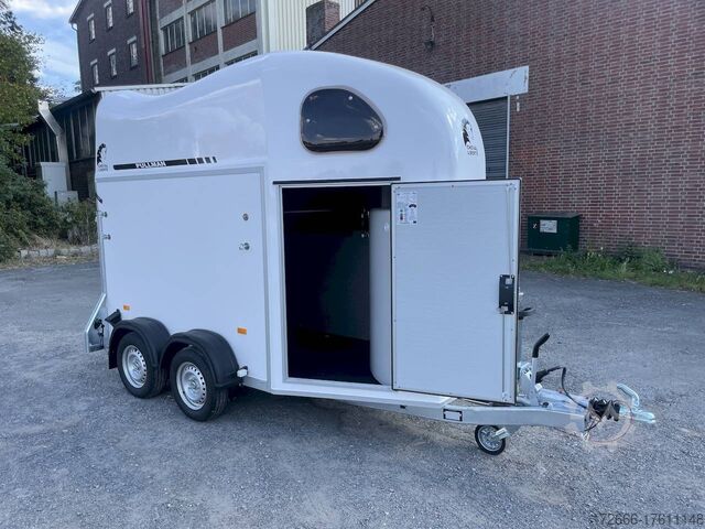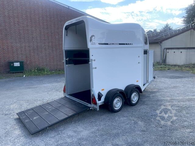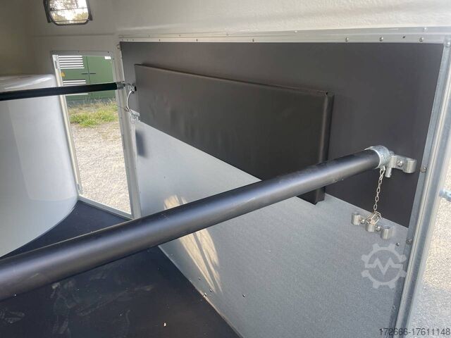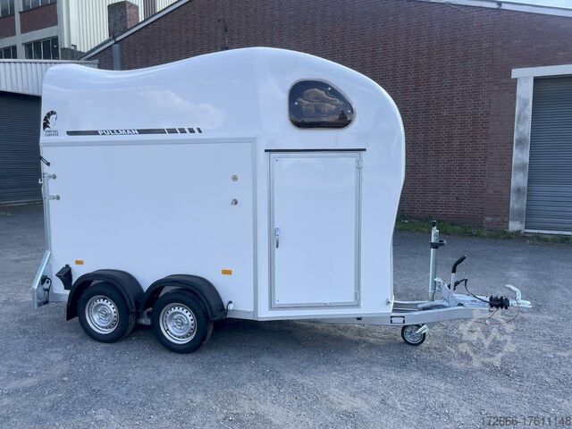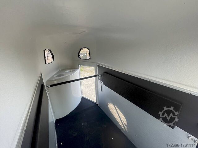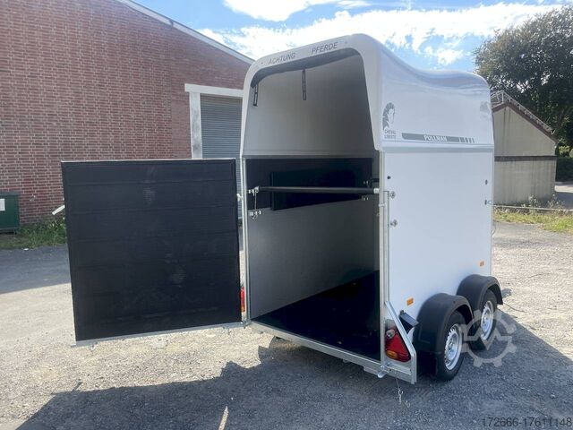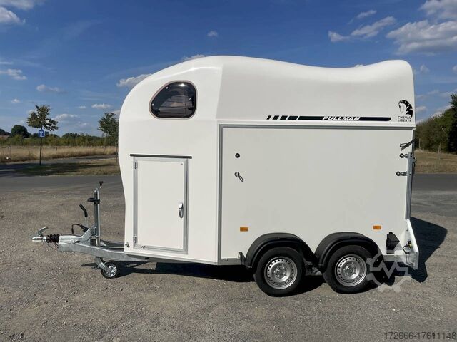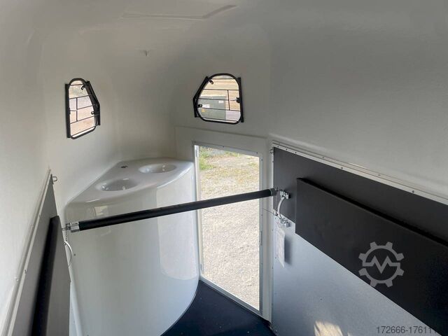 Hydraulics, automatic reverse drive, hot-dip galvanizing, * IMMEDIATELY AVAILABLE * Technical data: - Type: New vehicle - TÜV: New/2 years - Availability: IMMEDIATELY! - Number of animals: 1 + foal - Permissible total weight: 1,600 kg - Unladen weight: 685 kg - Payload: 915 kg - Interior dimensions: 318 x 140 x 230 cm (L x W x H) - Overall exterior dimensions: 452 x 184 x 270 cm (L x W x H) - Tires: 165/70R13 steel rim - Brake: yes - Support wheel: yes - Automatic with comfort handle - 100 km/h: included! - incl. vehicle documents Vehicle body: - Floor: Aluminum floor - Side walls/body: Plywood (wooden walls) - Roof material: Full polyester - Tack room: Yes - Tack room equipment: Luggage net, saddle holder can be swung out, make-up mirror, bridle holder, lockable door, door lock - Feed troughs: yes, recessed in tack room - Chassis: Pullmann 2 independent suspension with coil spring and shock absorber - Height of stall bars: 98 to 118cm, adjustable - Distance between stall bars: 171 to 191cm, adjustable - Distance between tack room and breast bar: outside 26 cm / with partition wall: 43 cm - Tailgate material: approx. 1000kg load capacity, rubber with tread strips and anti-slip - Tailgate function: hinged door and tailgate combination - Drain flap: no - Overrun device & brake: KNOTT - Lighting plug: 13-pin - Approval: COC papers, approval with green license plate possible for sports purposes Standard equipment: - Pullmann2 chassis independent wheel suspension with coil spring - incl. wheel shock absorbers (100km/h) Wheel shock absorber (100 km/h) - Aluminum floor - Plywood walls - Tethering option outside - Tethering option inside - Padded safety box bar system - Box bars with plastic protection throughout - Lockable entrance door - Door retainer on entrance door - Tinted and hinged windows with grille - Rubber glued to floor and sealed - Hay net hooks - Height adjustment for box bars - Panic release at front - Tarpaulin roller blind as net - Single wheel mudguards, plastic (black) - maneuvering handle - side pads (2 pieces) - depth adjustment for stall bars, - step protection on side walls (sheet steel) - lighting system with reversing lights - 13-pin plug Special equipment included in the price: - Saddle compartment inside with: Swivel saddle holder, net, mirror, snaffle holder Accessories can be retrofitted - please enquire: - Spare wheel with holder - Spare wheel cover - Cover for automatic jockey wheel - Anti-sling hitch - Weight reduction to different total weight - Aluminum rims - Approach mirror - Climbing aid - Storage bracket for saddle (KTL-coated) - Additional angle lever lock on door - Additional interior light at rear - Feed trough for hanging with holder - Full-length, padded (rear) stall rail with additional holders - Full-length stall rail, padded (rear) with additional holders Box bar continuous, padded (front) with additional holders - Wear mat - Video surveillance system incl. reversing camera - Aluminum head partition on PVC partition - Grid head partition on PVC partition - Various decors New vehicle with warranty and TÜV. We are happy to offer you suitable financing !, Descriptions and pictures are protected by copyright !!! Over 800 trailers immediately available for you! We are for over 30 years Brian James / Humbaur / Hapert / Unsinn / Cheval Liberte / Koch / Debon / Stedele / TPV / Tohaco / Vezeko / Variant / Vlemmix - specialized dealer & repair - workshop - delivery Germany-wide with surcharge possible! Anh