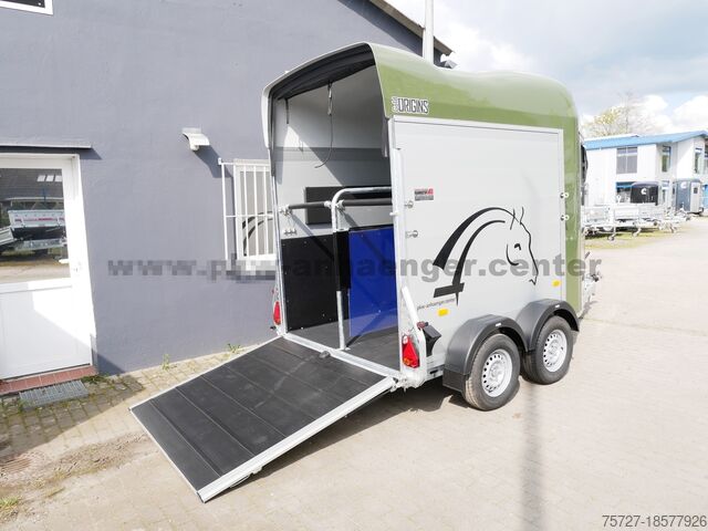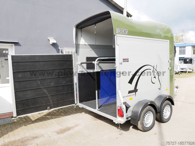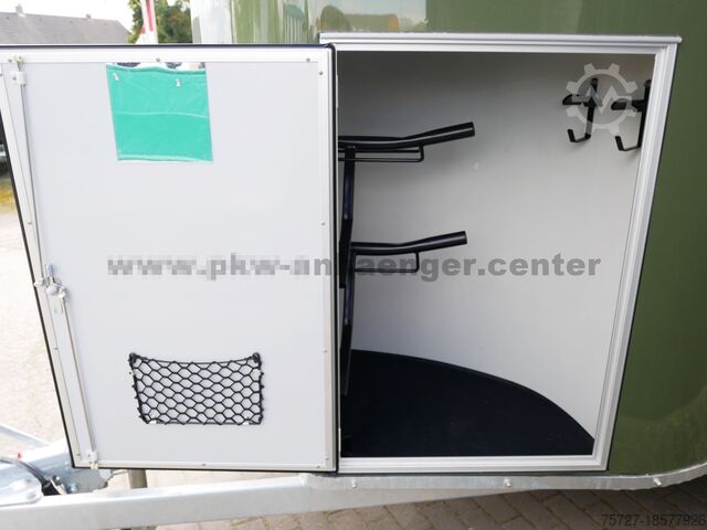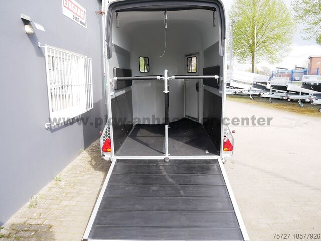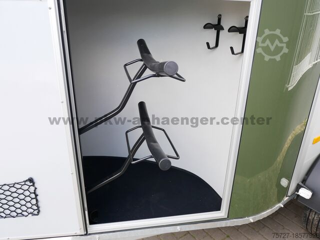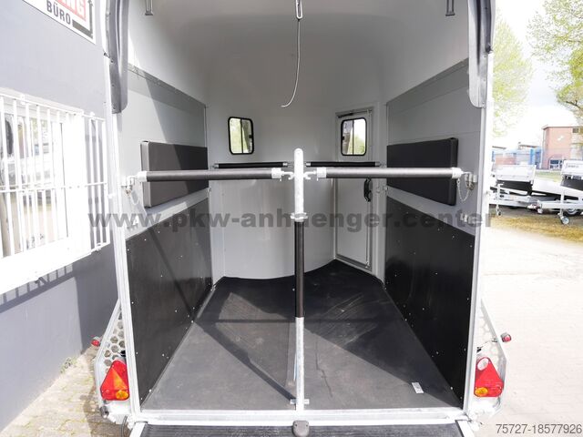 The two-horse trailer is equipped with a rubber spring axle, saddle room, polyester hood, aluminum walls, aluminum floor, entry door, flap door system, interior light, automatic support wheel, stable frame, V-drawbar and so on.