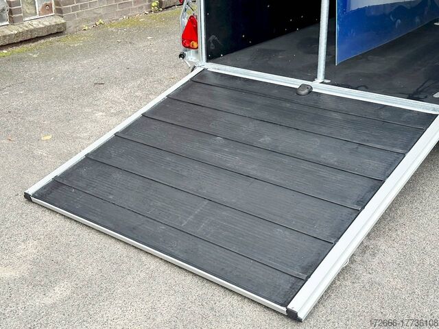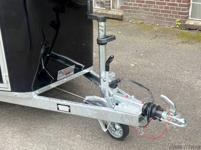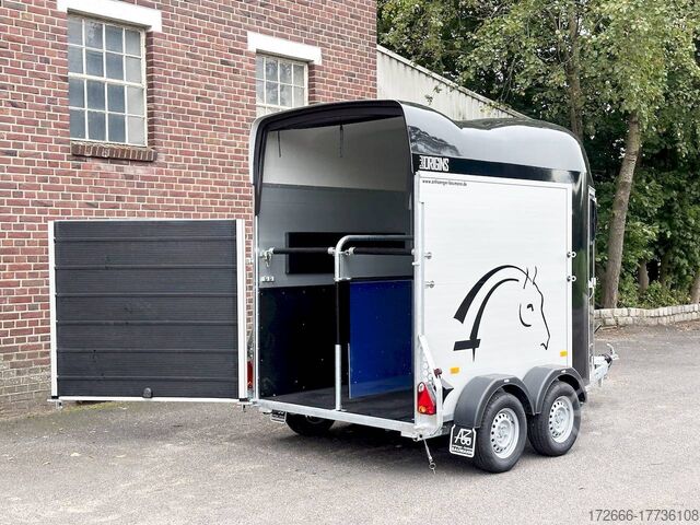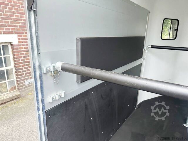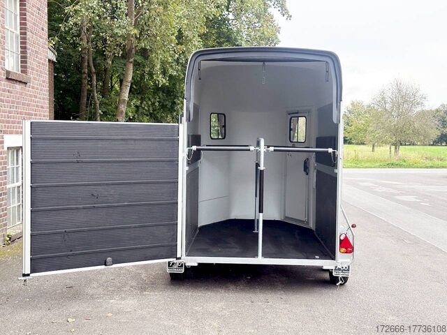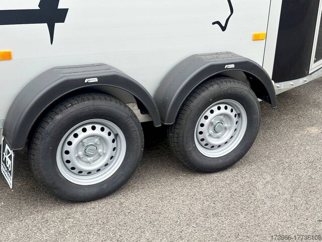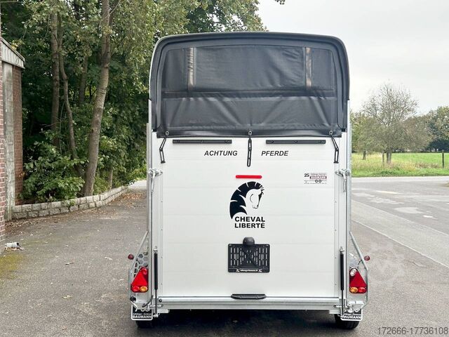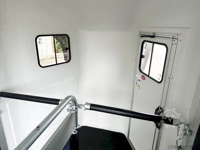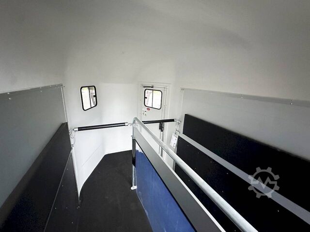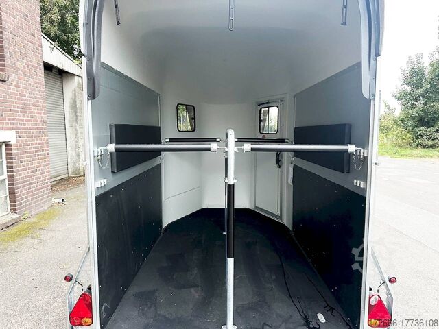Hydraulics, automatic reverse drive, hot-dip galvanizing, * IMMEDIATELY AVAILABLE* Technical data: - Type: New vehicle - TÜV: New/2 years - Availability: IMMEDIATELY - Number of animals: 2 - Gross vehicle weight: 2,000 kg - Unladen weight: 750 kg - Payload: 1.250 kg - Interior dimensions: 317 x 167 x 235 cm (L x W x H) - Overall exterior dimensions: 447 x 213 x 270cm (LxWxH) - Tires: 185/70R13 steel rim - Brake: yes - Support wheel: yes - Automatic with comfort handle - 100km/h: optional - incl. vehicle registration document and vehicle documents Vehicle body: - Floor: ALUMINIUM floor - Side walls/body: Anodized double-walled aluminium - Roof material: Full polyester - Tack room: No - Chassis: Knott rubber spring axles with single wheel suspension - Height of stall bars: 99 to 119cm, adjustable - Distance between stall bars: 172 to 187cm, adjustable - Distance between tack room and breast bar: outside 32cm / with partition wall: 48cm - Tailgate material: approx. 1000kg load capacity, rubber with tread strips and anti-slip - Tailgate function: Hinged door and tailgate combination - Drain flap: no - Overrun device & brake: KNOTT - Lighting plug: 13-pin - Approval: ZBII & COC papers Standard equipment: - Aluminum floor - Aluminum walls - Tethering option outside, - Tethering option inside, - Padded safety stall bar system - Height adjustment for stall bars - Depth adjustment for stall bars - Panic release at front - High access door - Access door lockable - Door retainer on access door - PVC clear view partition - Large front window can be pushed open at front - Rubber glued to floor and sealed - Hay net hooks - PVC clear view partition - Single wheel mudguards, Plastic (black) - Interior light at rear - Side pads (2 pieces) - Step protection on side walls (GRP plastic) - Tarpaulin roller blind as net - Maneuvering handle - Lifting device gas pressure shock absorber on tailgate - Step on rear flap - 3rd brake light on rear flap - Light on rear flap - Light on rear flap - Light on rear flap - Light on rear flap - Light on rear flap. Third brake light on rear flap - Lighting system with reversing light - 13-pin plug Accessories can be retrofitted - please enquire: - Wheel shock absorber (100 km/h) - Cover for automatic support wheel - Spare wheel with holder - Spare wheel cover - Anti-sway hitch - Weight reduction to different total weight - Aluminum rims - Approach mirror - Climbing aid - Storage bracket for saddle (KTL-coated) - Additional interior light - Foal grille - Feed trough for hanging with holder - Chest bar pad - Box bar continuous, padded (rear) - Full-length, padded stall rail (front) - Wear mat/scratch mat - Video surveillance system incl. reversing camera New vehicle with warranty and TÜV. We are happy to offer you suitable financing !, Descriptions and pictures are protected by copyright !!! Over 800 trailers immediately available for you! We are for over 30 years Brian James / Humbaur / Hapert / Unsinn / Cheval Liberte / Koch / Debon / Stedele / TPV / Tohaco / Vezeko / Variant / Vlemmix - specialized dealer & repair - workshop - delivery Germany-wide with surcharge possible! Anhänger Zentrum BAUMANN GmbH Dinxperloer Str. 389 46399 Bocholt - Errors, omissions and prior sale excepted -