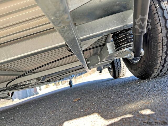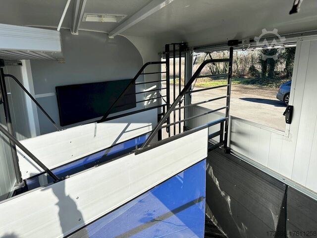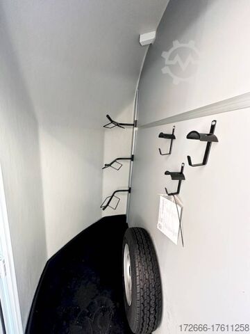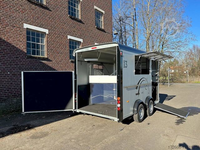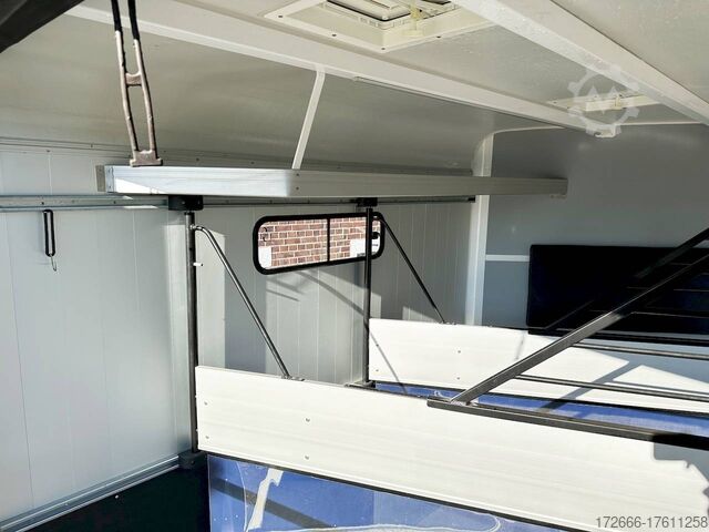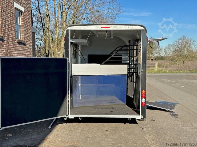 Hydraulics, automatic reverse drive, hot-dip galvanizing, 2x roof ventilator, interior ceiling storage, * IMMEDIATELY AVAILABLE * incl. 2x roof ventilator, interior ceiling storage Technical data: - Type: New vehicle - TÜV: New/2 years - Availability: IMMEDIATELY! - Number of animals: 3 - Gross vehicle weight: 3,500 kg - Unladen weight: 1,280 kg - Payload: 2,220 kg - Interior dimensions: 420 x 207 x 230 cm (L x W x H) - Overall exterior dimensions: 527 x 234 x 272 cm (L x W x H) - Brake: yes - Support wheel: yes - Automatic with comfort handle - 100 km/h: Included! - incl. vehicle documents Vehicle body: - Floor: ALUMINIUM floor - Side walls/body: Anodized double-walled aluminium - Roof material: full polyester - Colour: black - Tack room: yes - Tack room equipment: luggage net, saddle holder, make-up mirror, bridle holder, lockable door, door lock - Feed troughs: no - Chassis: Pullmann 2 independent suspension with coil spring and shock absorber - Height of stall bars: - - Distance between partitions: - Tailgate material: approx. 1000kg load capacity, rubber with tread strips and anti-slip - Tailgate function: hinged door and tailgate combination - Drain flap: yes front wide - Overrun device & brake: KNOTT - Plug lighting: 13-pin - Approval: COC papers, approval with green license plate possible for sports purposes Standard equipment: - Pullmann2 chassis independent wheel suspension with coil spring - incl. Wheel shock absorber (100 km/h) - Aluminum floor - Aluminum walls - External tie-down option - Internal tie-down option - Adjustable and telescopic partitions with head grille - PVC transparent partitions - Individual wheel mudguards, plastic (black) - drain flap at front - side opening flaps - many sliding windows - rubber glued to floor and sealed - hay rack - step protection on side walls (GRP plastic) - maneuvering handle - spare wheel with holder - tarpaulin roller blind as net - lifting device gas pressure shock absorber on tailgate - step on rear flap - 3rd brake light on rear flap - light on rear flap - light on rear flap - light on rear flap - light on rear flap. Third brake light on tailgate - Lighting system with reversing light - 13-pin plug Special equipment included in the price: - 2 roof ventilators - Interior ceiling shelf Accessories can be retrofitted - please enquire: - Cover for automatic support wheel - Anti-sway hitch - Weight reduction to different total weight - Aluminum rims - Approach mirror - Climbing aid - Saddle storage bracket (KTL-coated) - Feed trough for hanging with holder - Video surveillance system incl. reversing camera - Anti-theft device New vehicle with warranty and TÜV. We are happy to offer you suitable financing !, Descriptions and pictures are protected by copyright !!! Over 800 trailers immediately available for you! We are for over 30 years Brian James / Humbaur / Hapert / Unsinn / Cheval Liberte / Koch / Debon / Stedele / TPV / Tohaco / Vezeko / Variant / Vlemmix - specialized dealer & repair - workshop - delivery Germany-wide with surcharge possible! Anhänger Zentrum BAUMANN GmbH Dinxperloer Str. 389 46399 Bocholt - Errors, omissions and prior sale excepted -